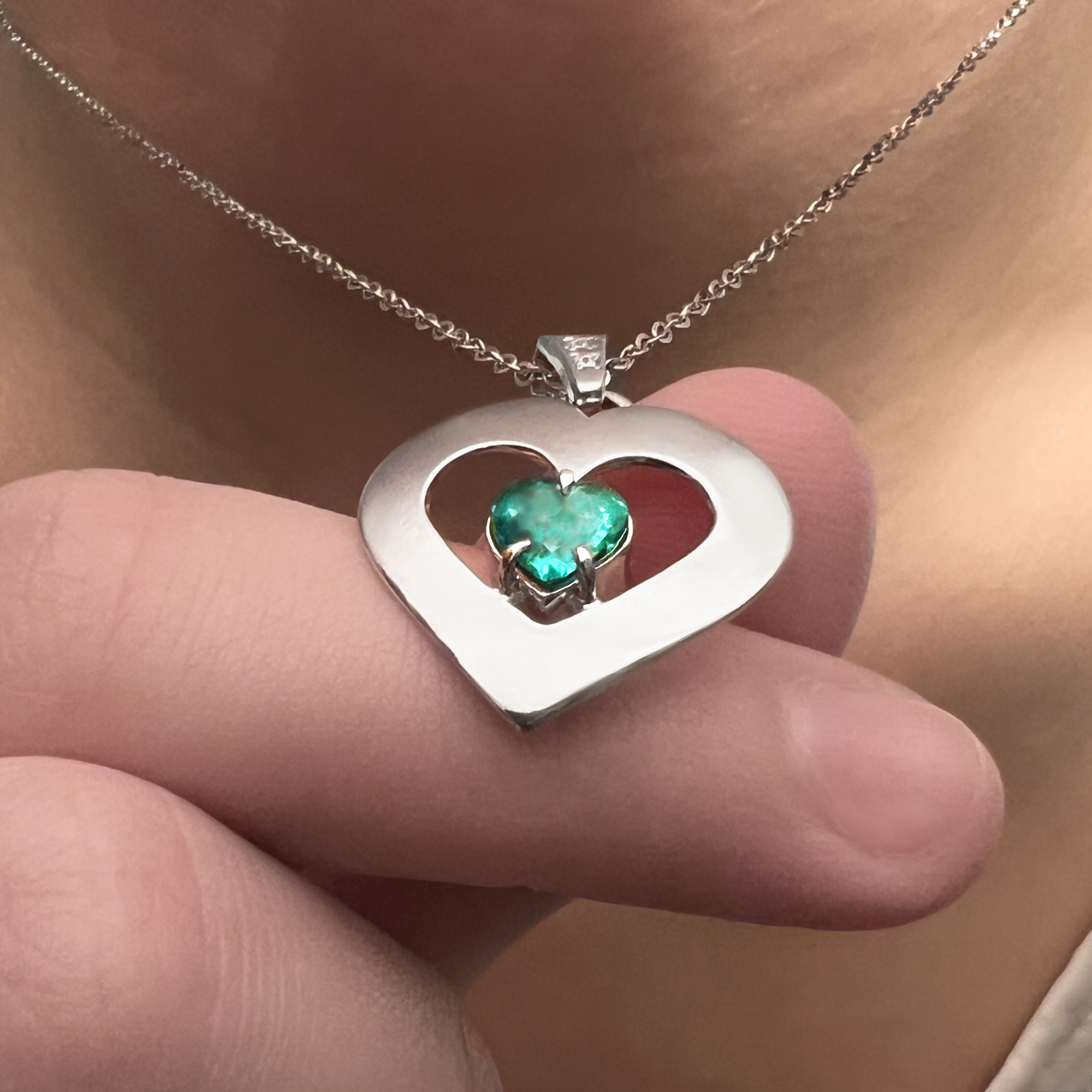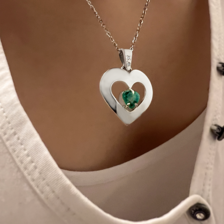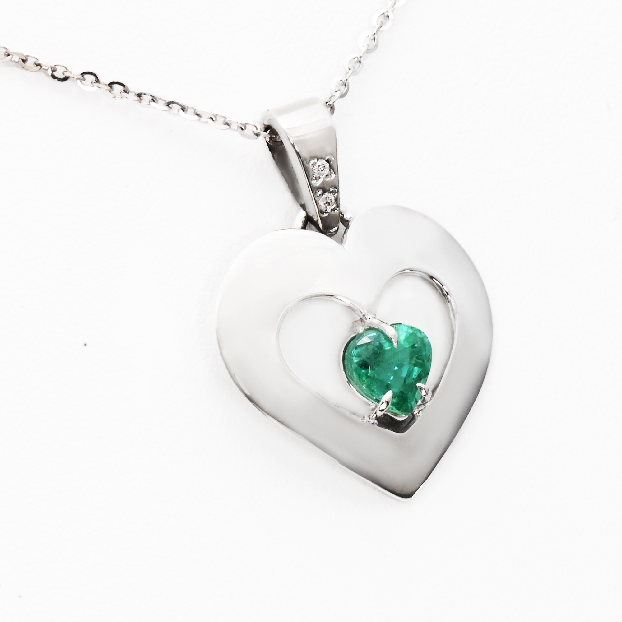 přívěsek srdce je v rozměru 21*24 mm, smaragd ve výbrusu srdce má jiskřivě zelenou barvu a váží 1 ct, 2 přírodní diamanty v průměru 1.2 mm