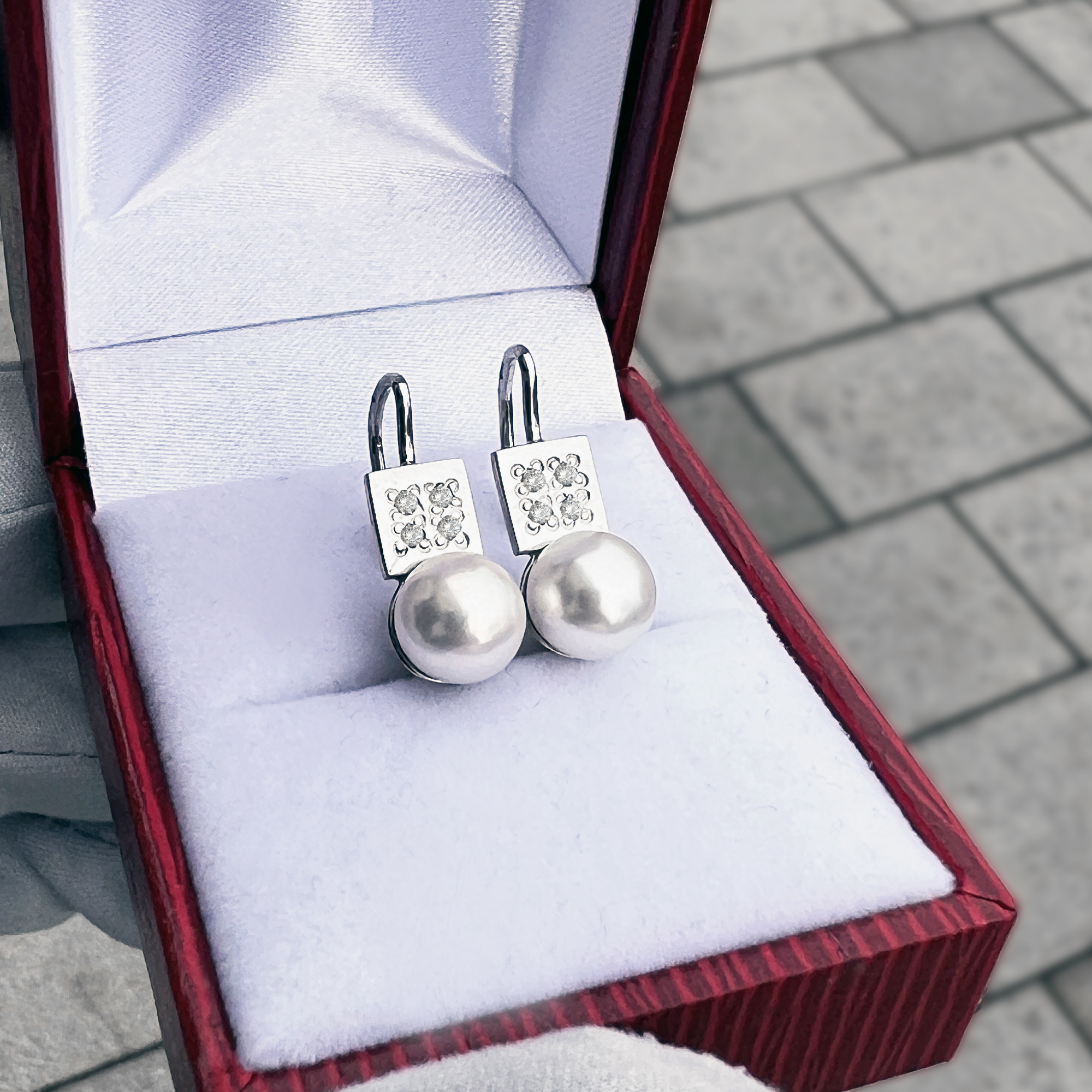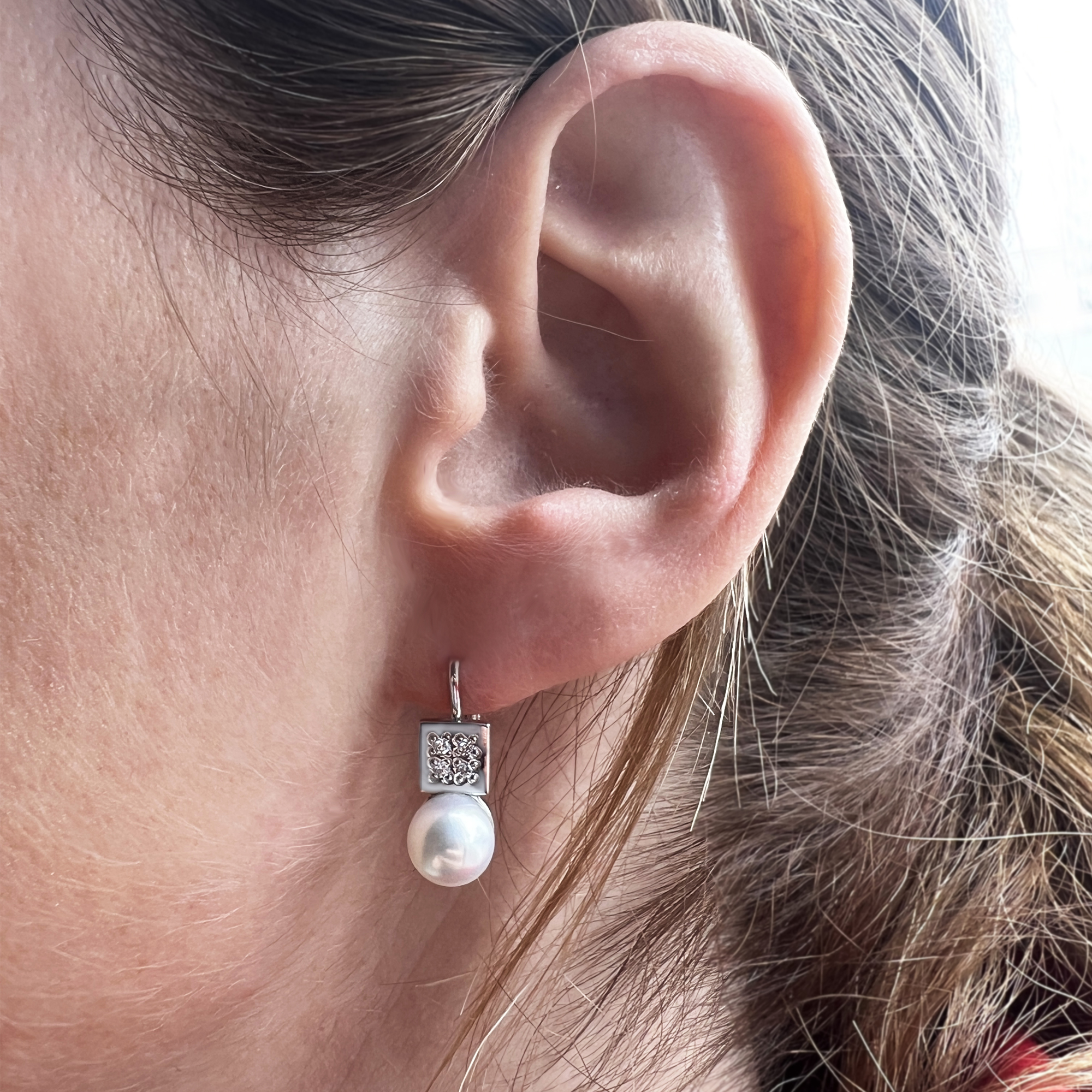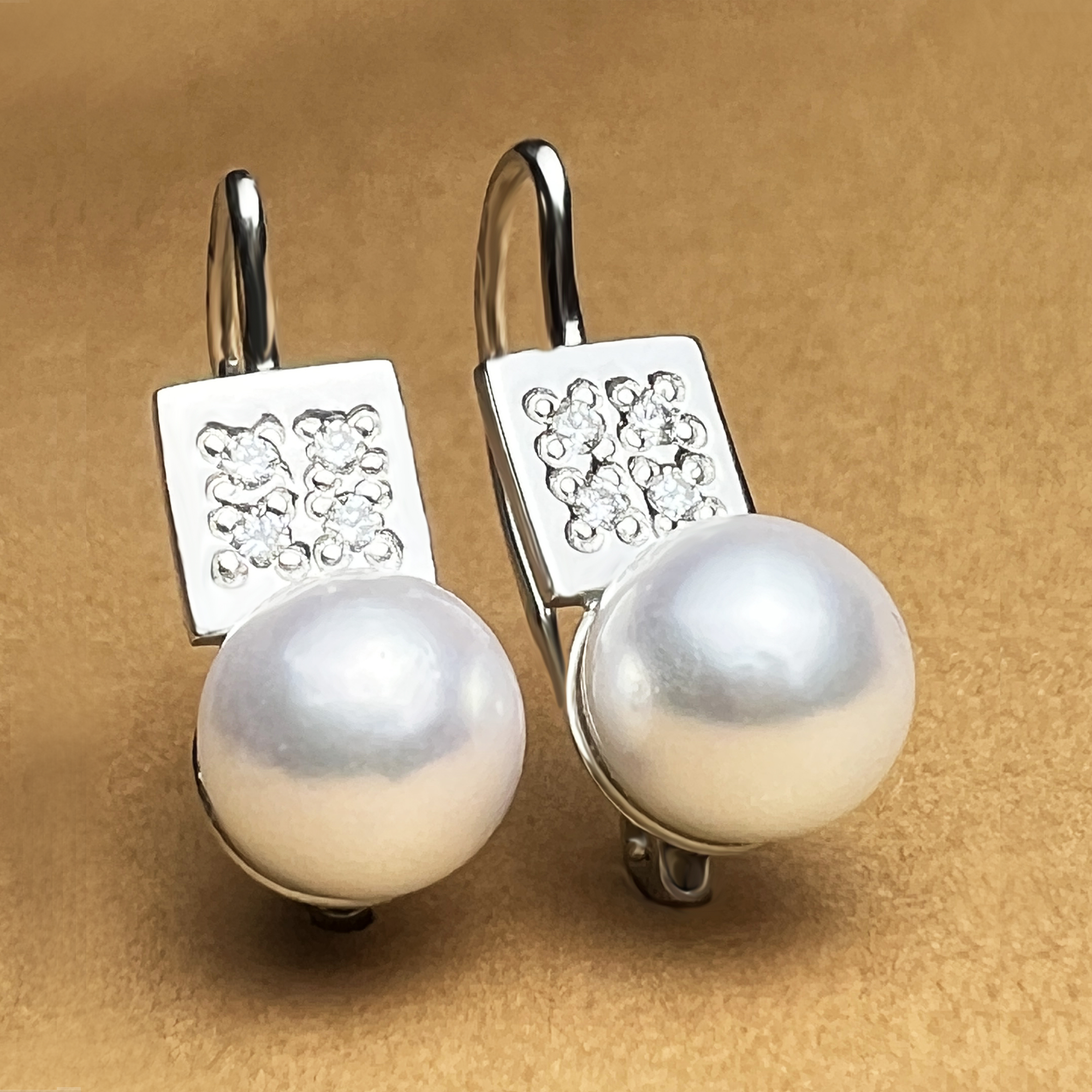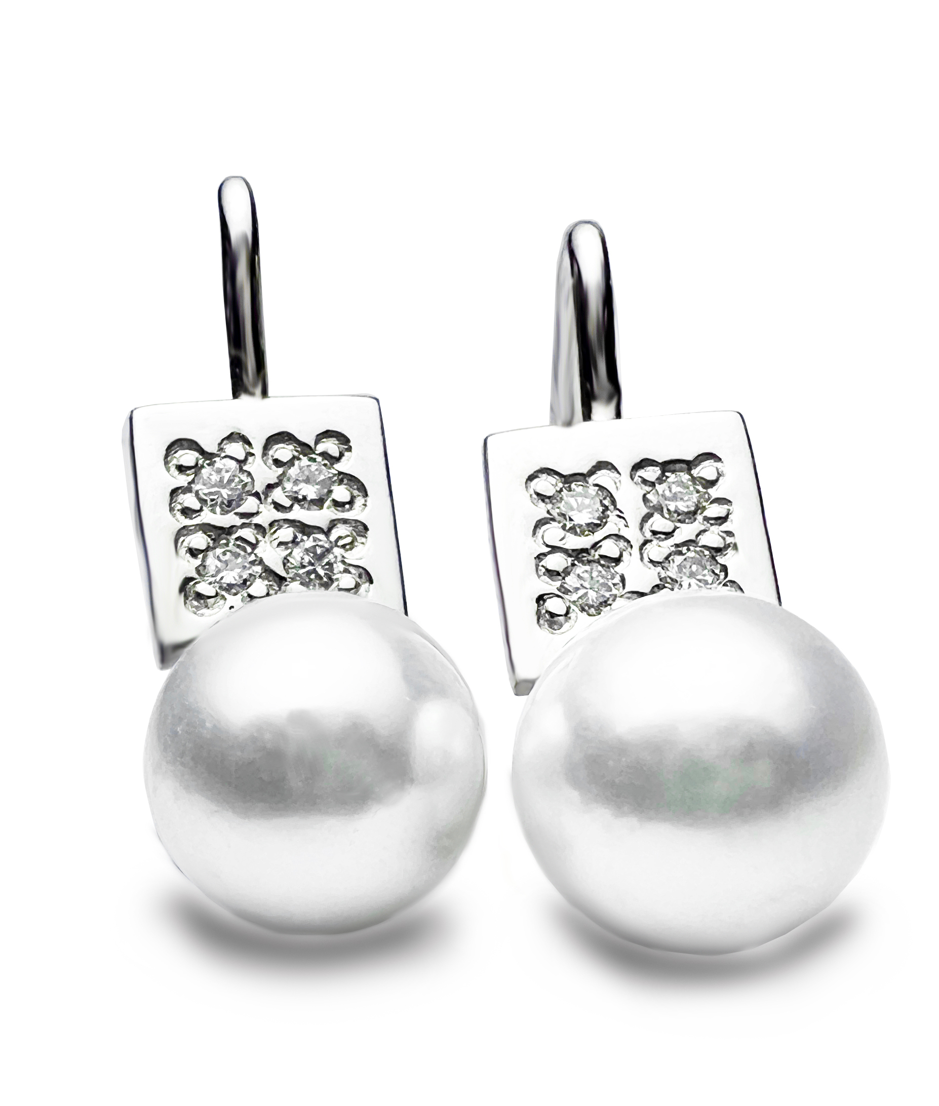 Originální zlatá perlové náušnice v bílém zlatě. Krásný kontrast 2 geometrických tvarů perly a čtverce z bílého zlata. Celou kompozici doplňují zářivé diamanty. Vše v jemném provedení s bezpečným zapínání na klapku.