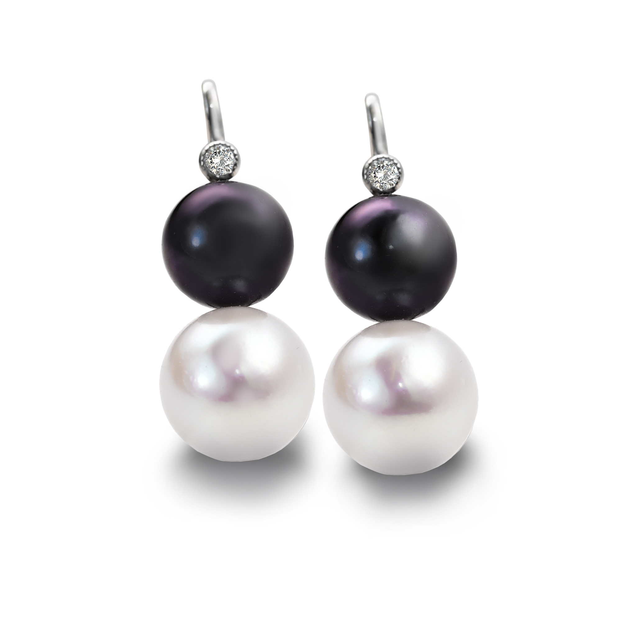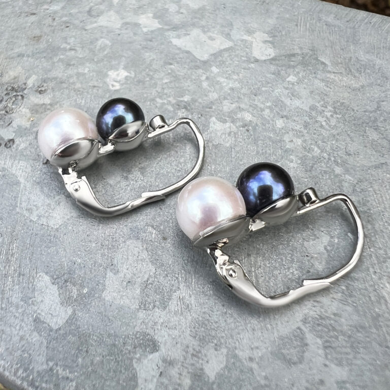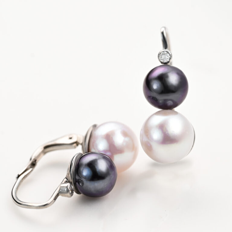sladkovodní perly v průměru 8 mm (bílé) a 7 mm (černo fialové)