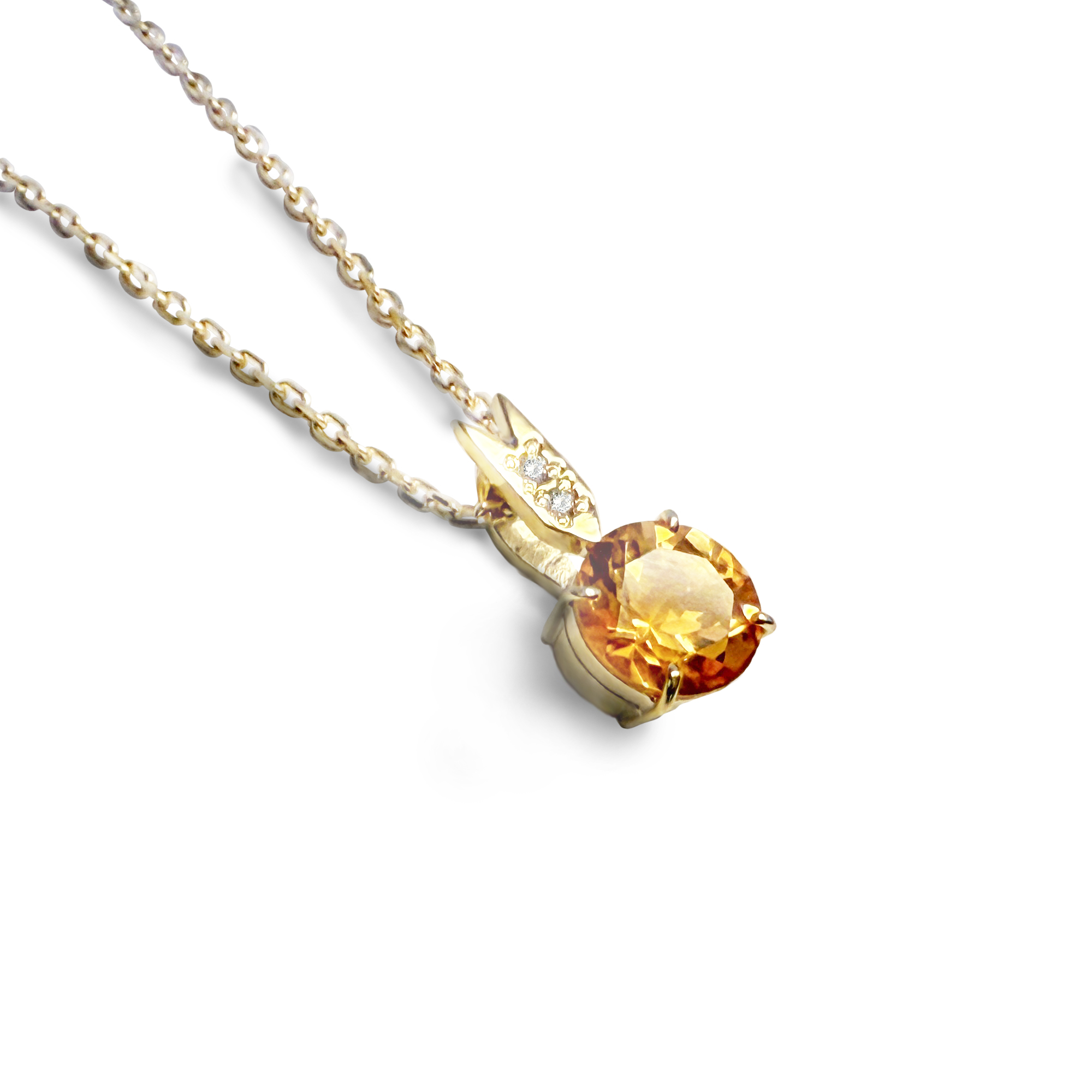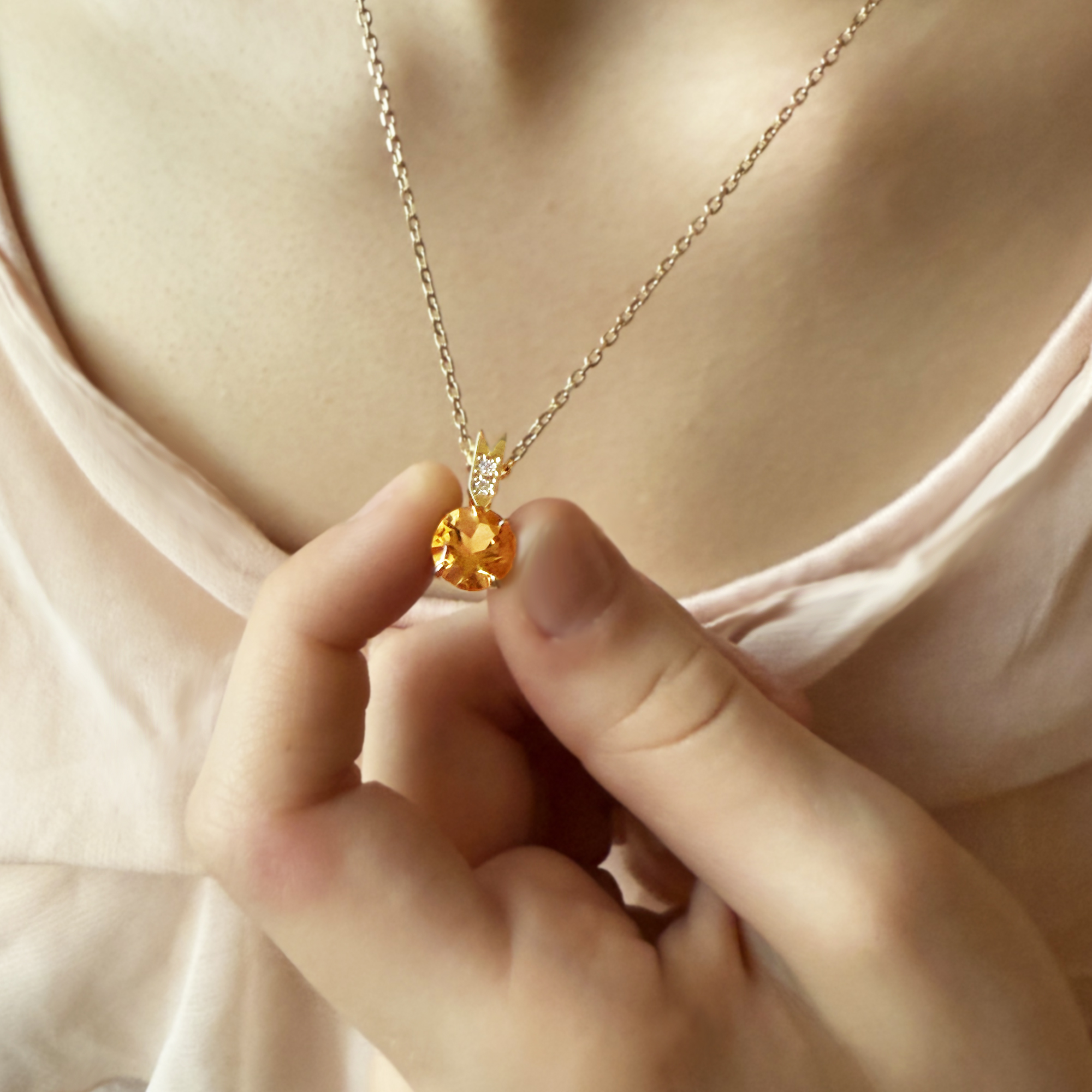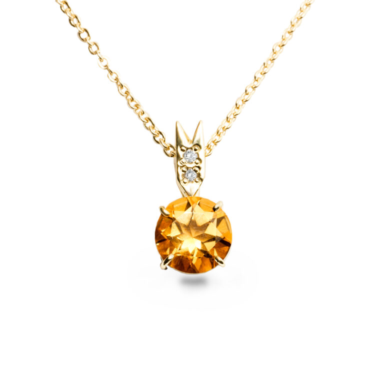 přírodní citrín medově oranžové barvy v průměru 9 mm doplňují 2 přírodní diamanty o celkové váze 0.034 ct kvality SI1 barvy bílé G