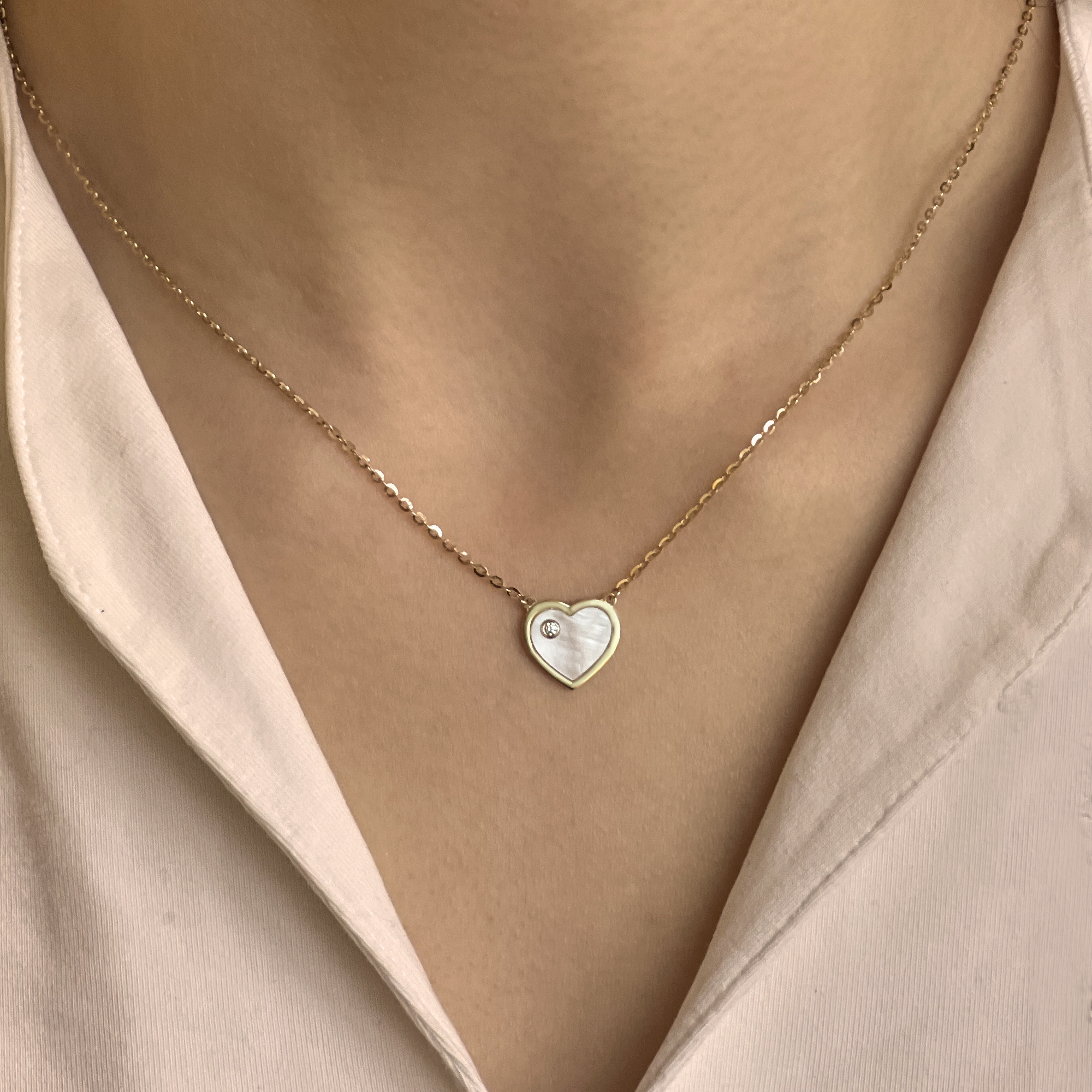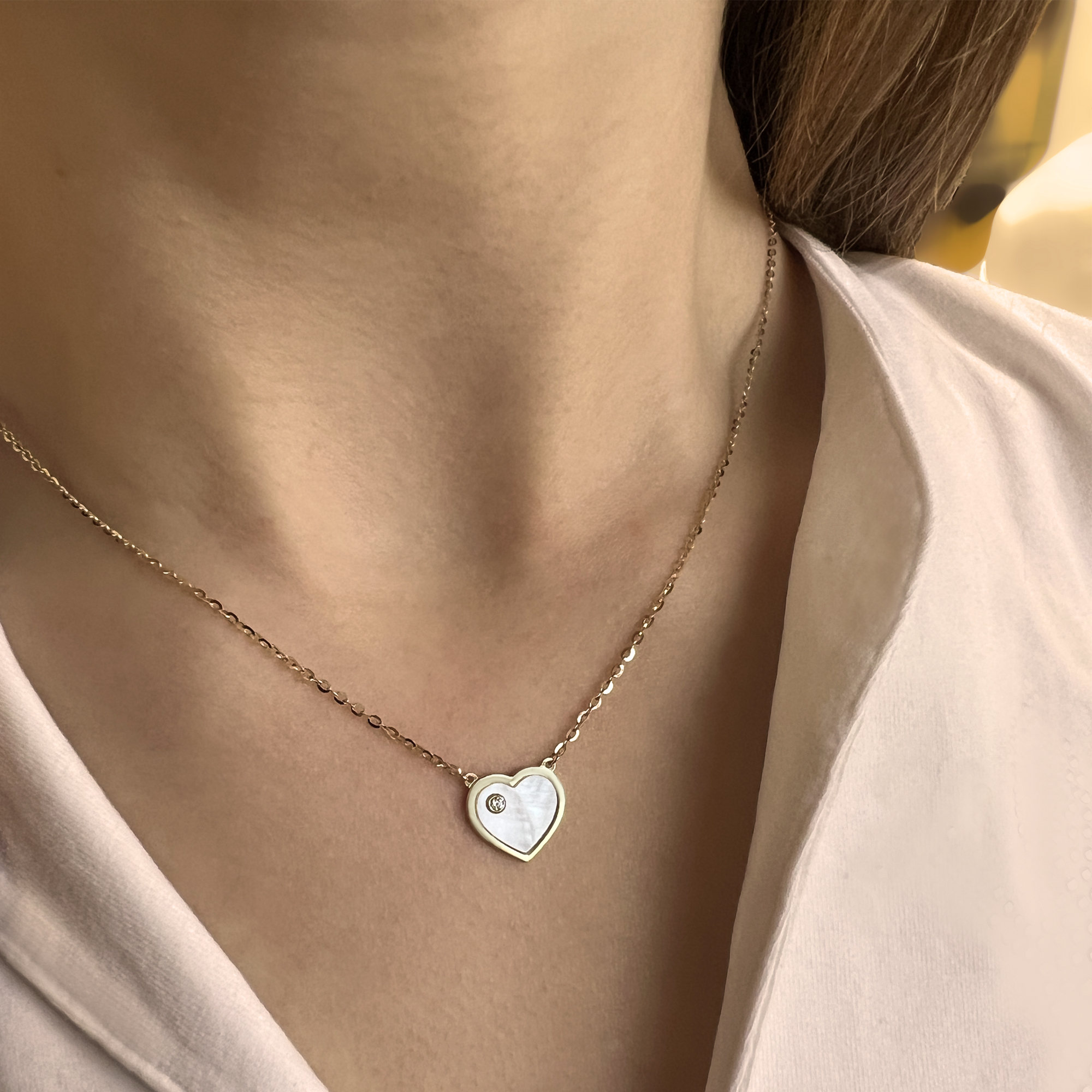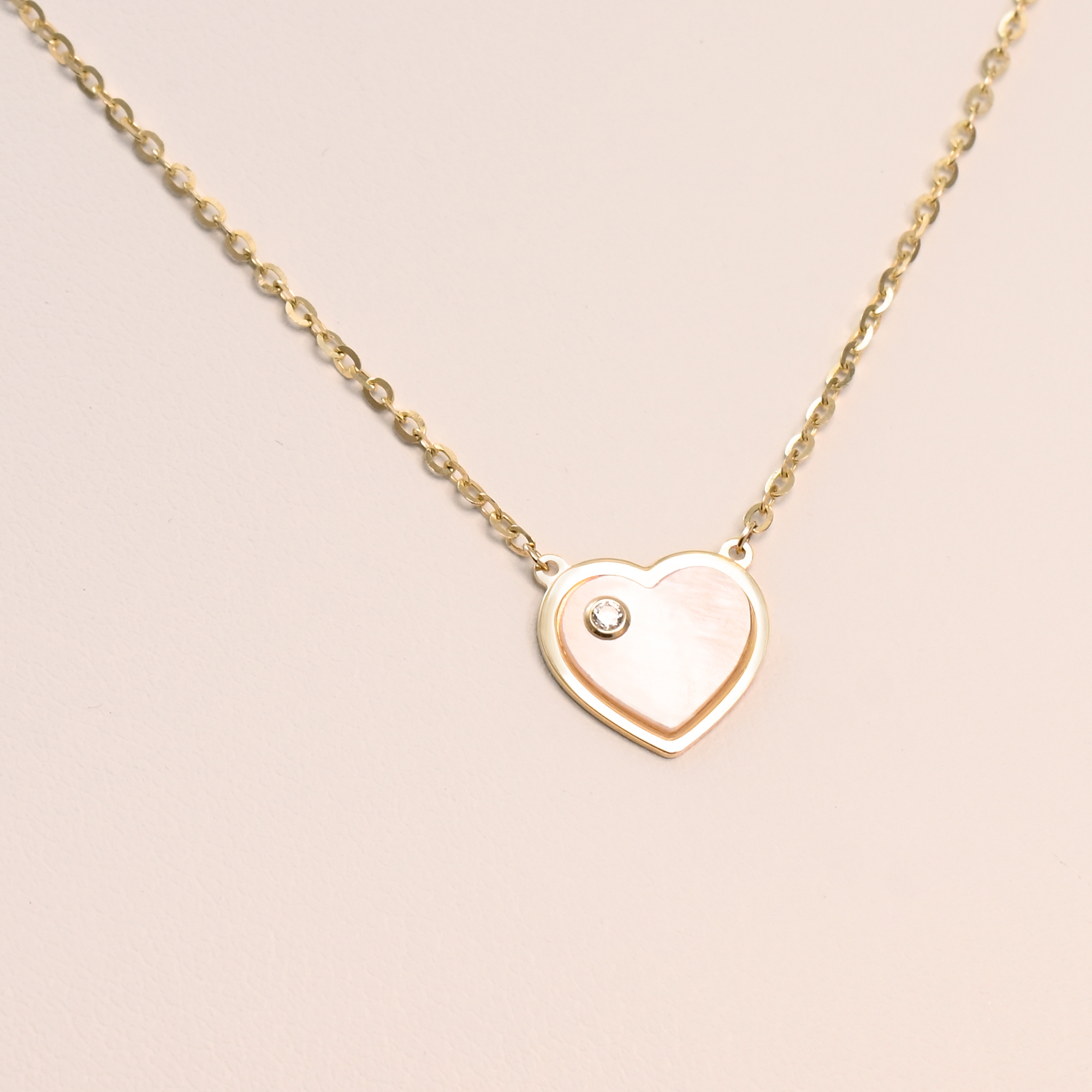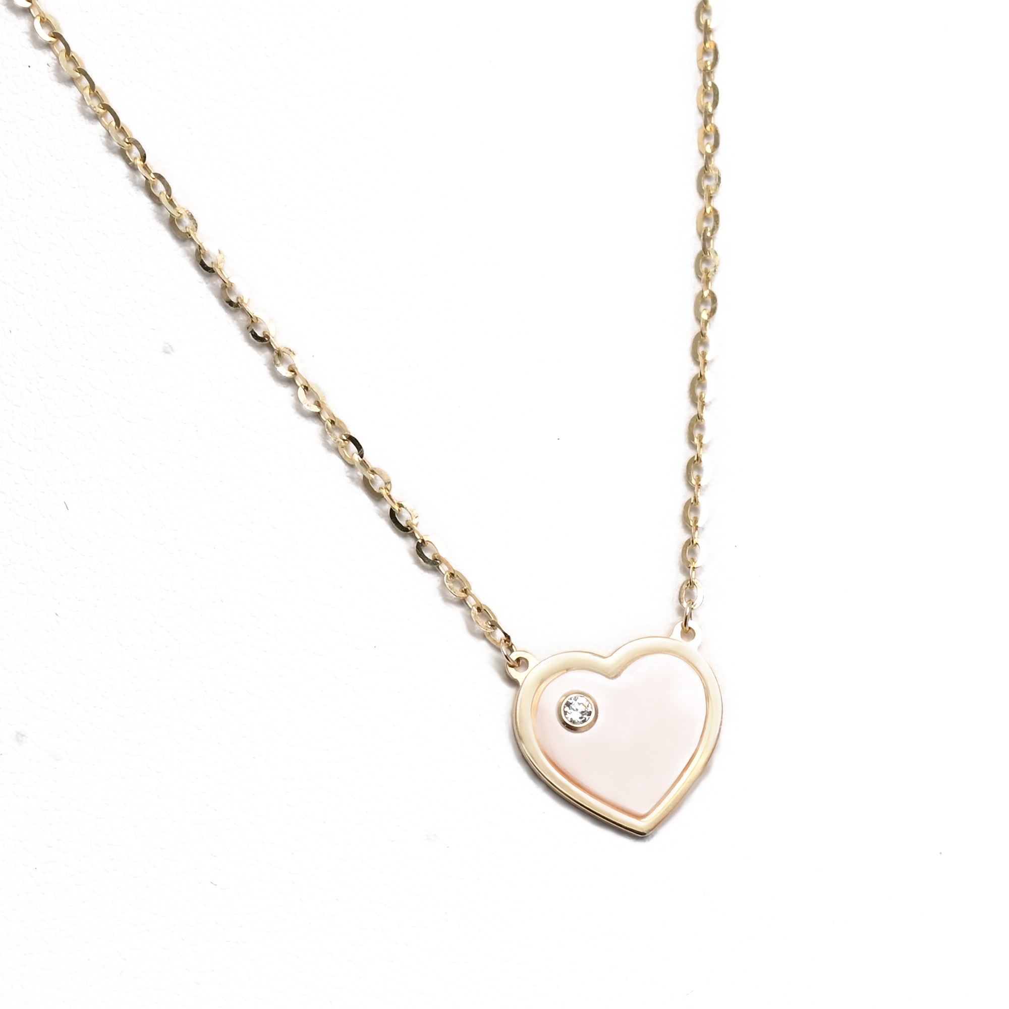 Dámský zlatý náhrdelník se zavěšeným přívěskem ve tvaru perleťového srdce se zirkonem.