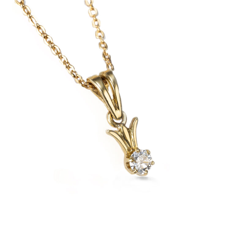 Diamantový přívěsek jsme navrhli a vyrobili v naší zlatnické dílně ve Zlíně. Řetízek je v délce 40 cm. Na přání dokážeme dodat i v délce 42 cm, 45 cm nebo 50 cm. Celková váha setu je 3.98g (2.78g řetízek + 1.20g přívěsek)
