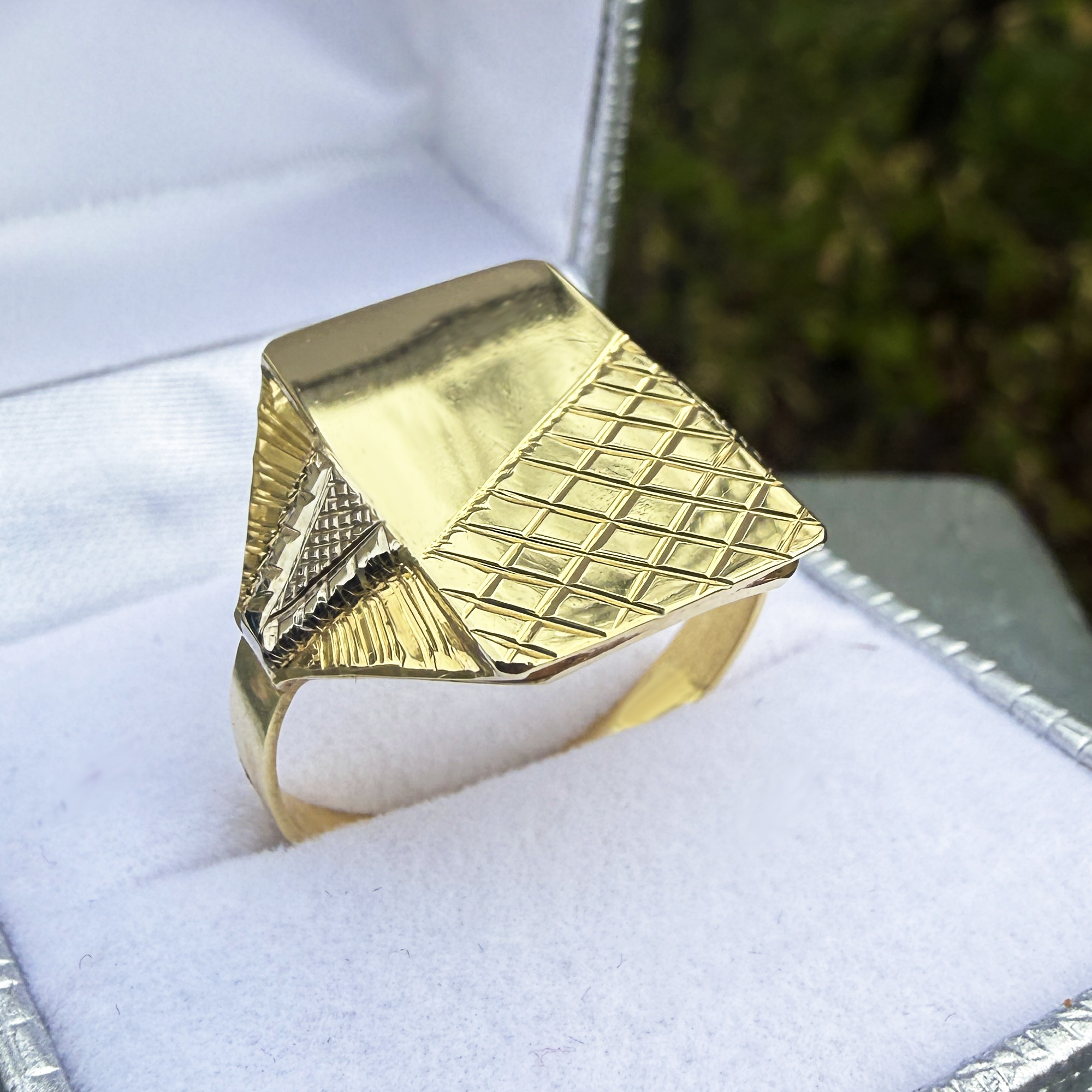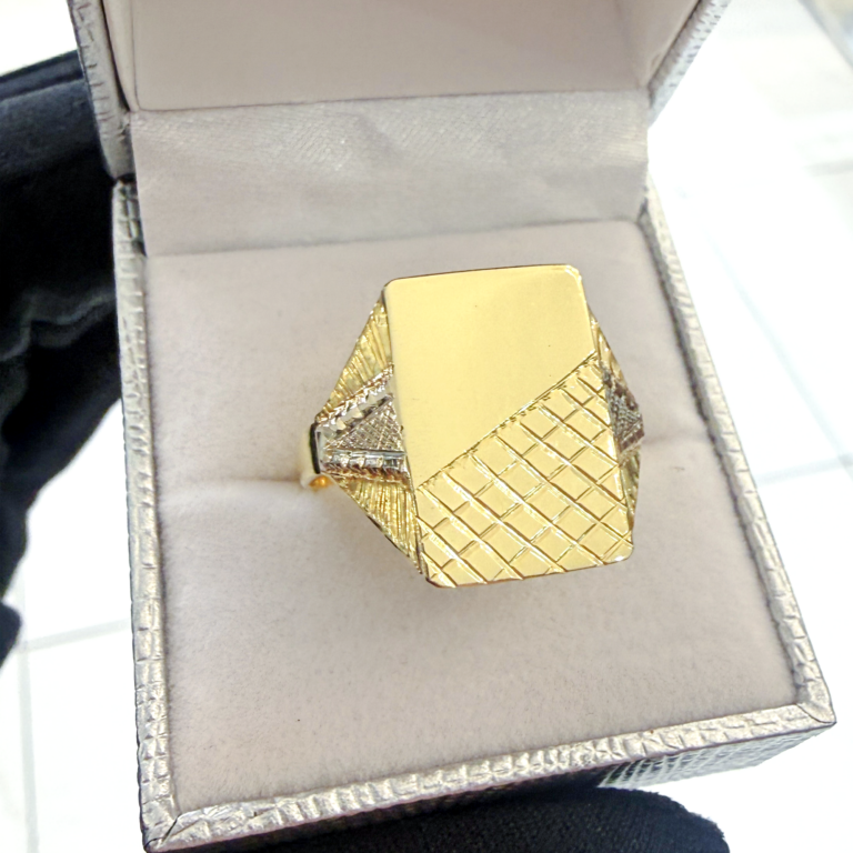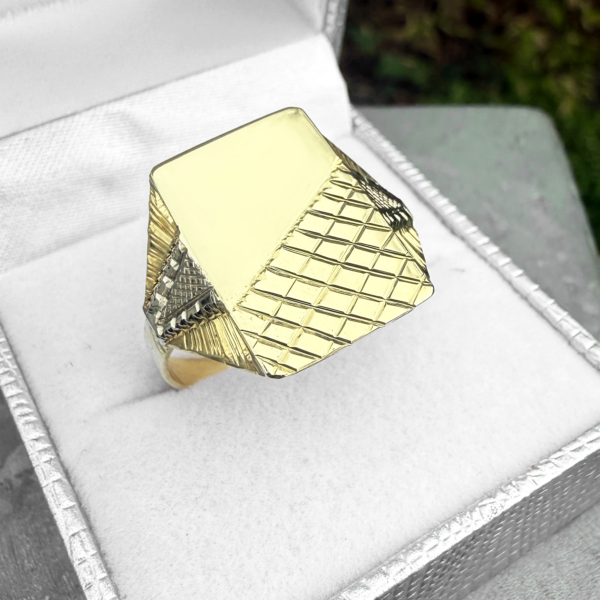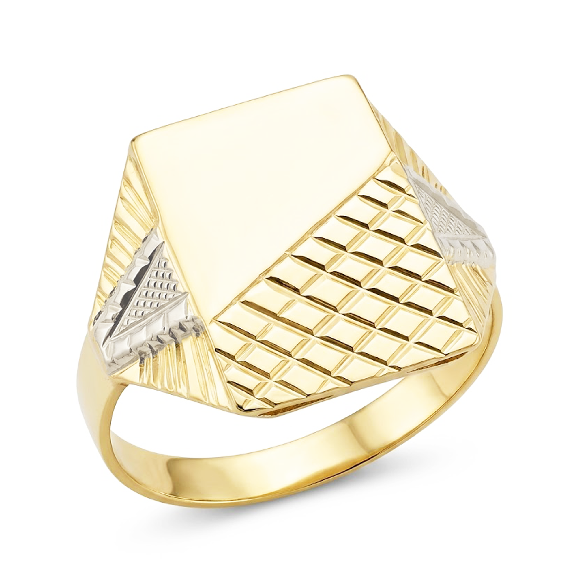 Elegantní zlatý pánský prsten je vyrobený ze žlutého zlata v kombinaci s bílým zlatem ryzosti 585/1000.