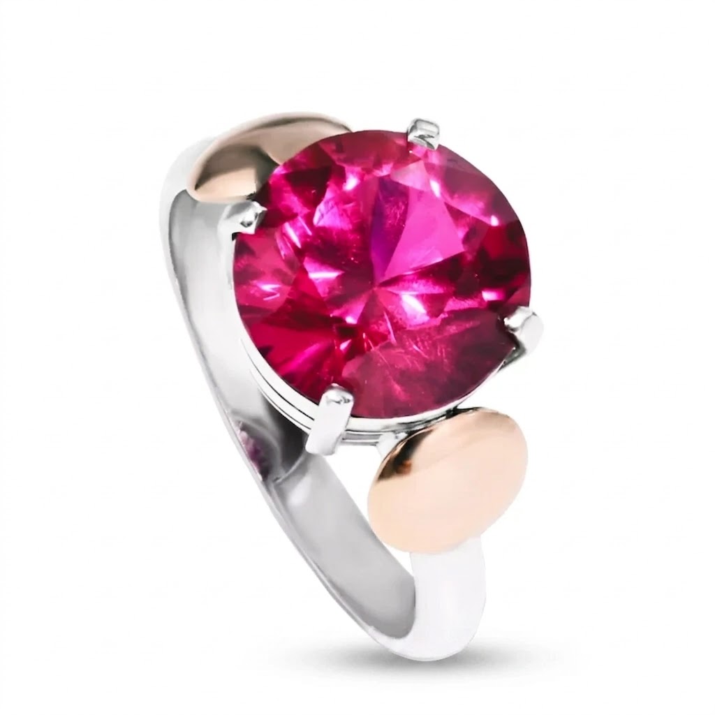 Výrazný prsten se sytě růžovým zirkonem. Ruční práce.