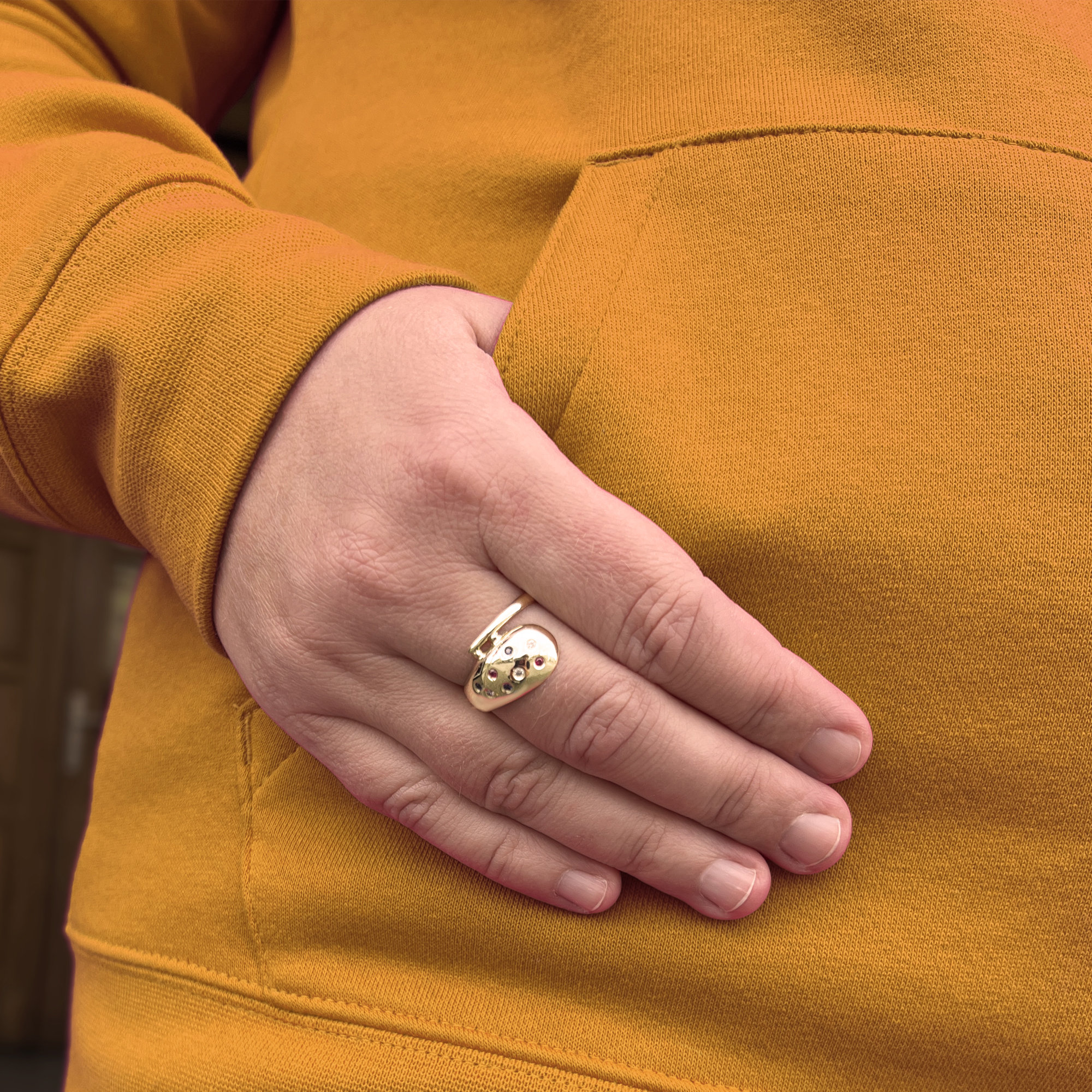 Výrazný zlatý prsten zdobený zirkony.
