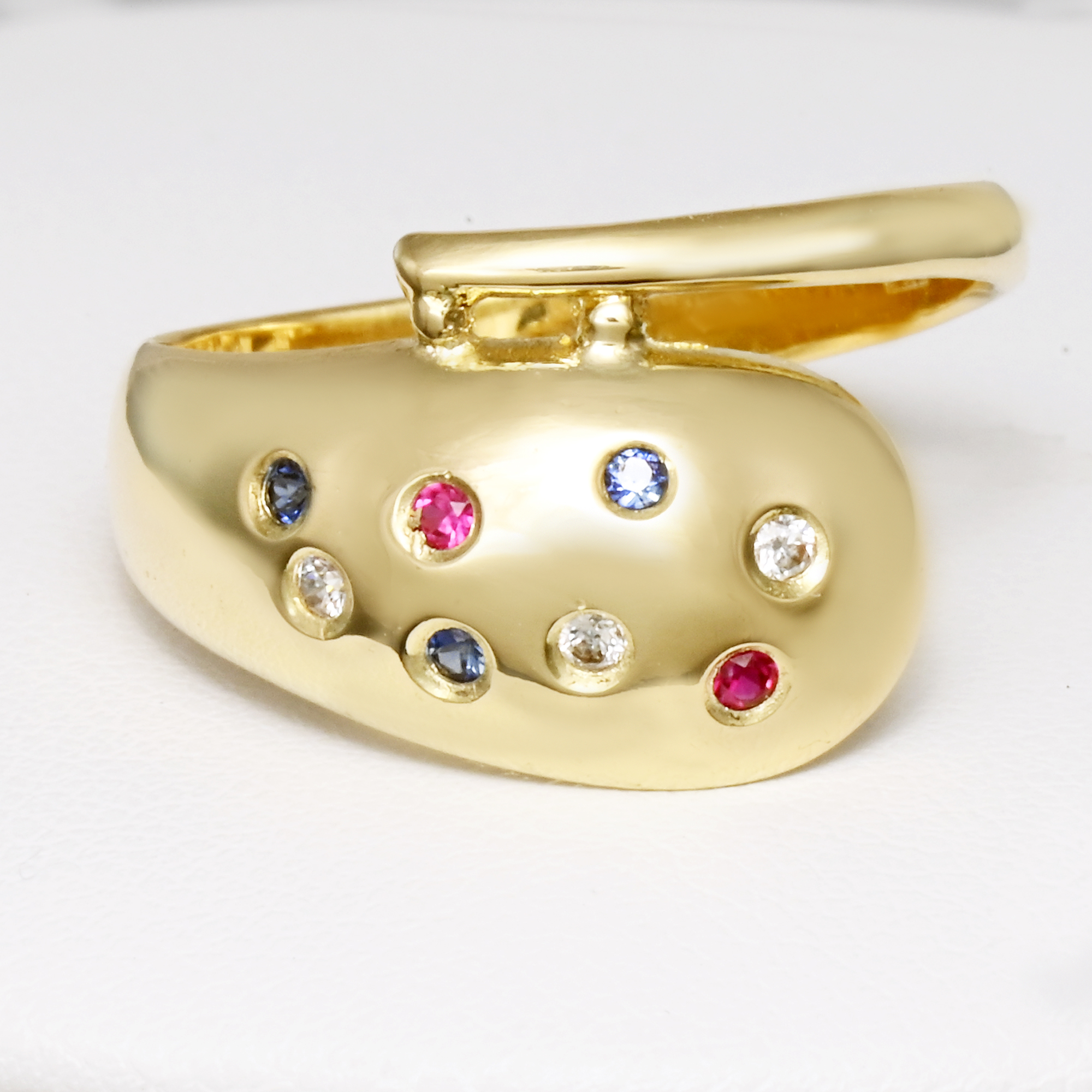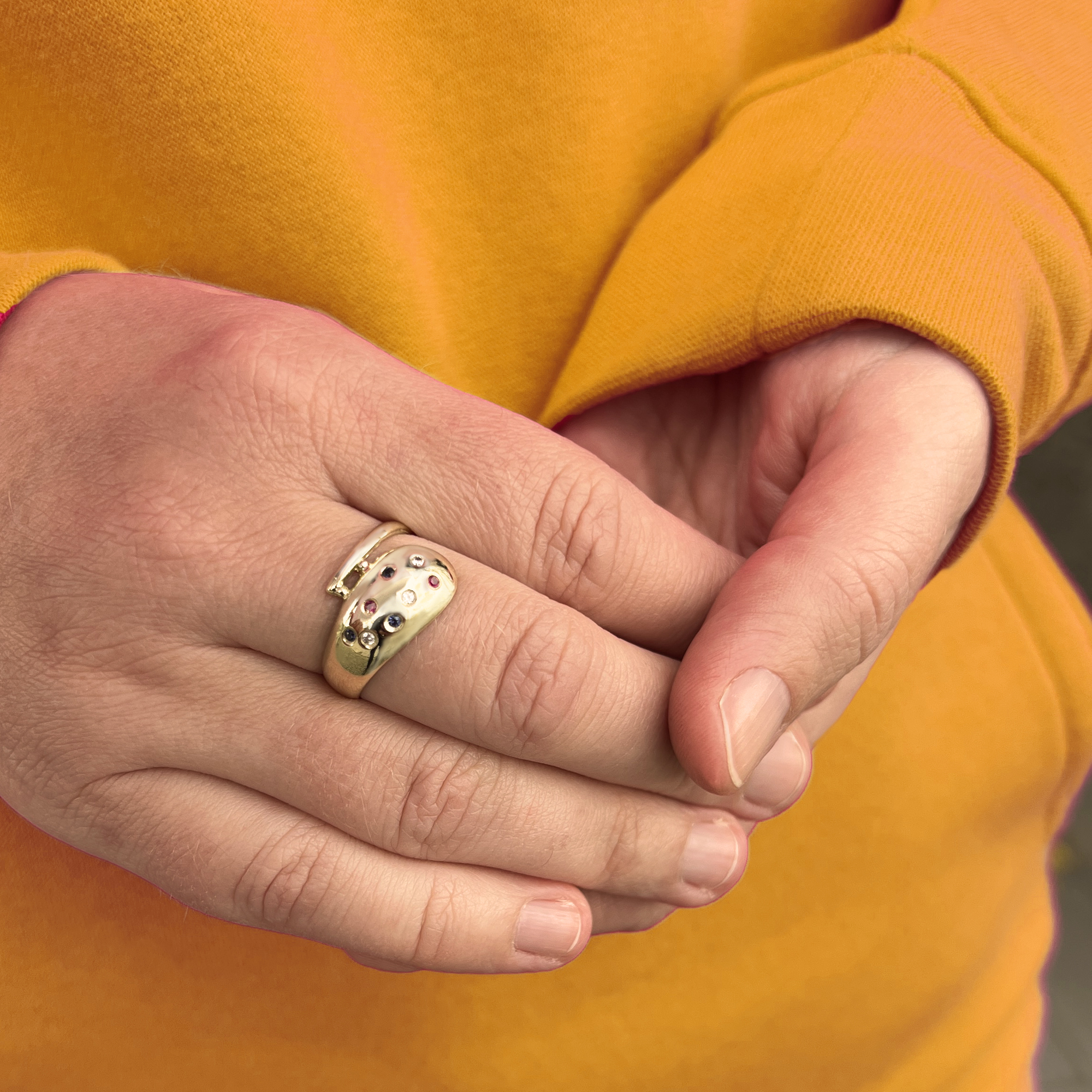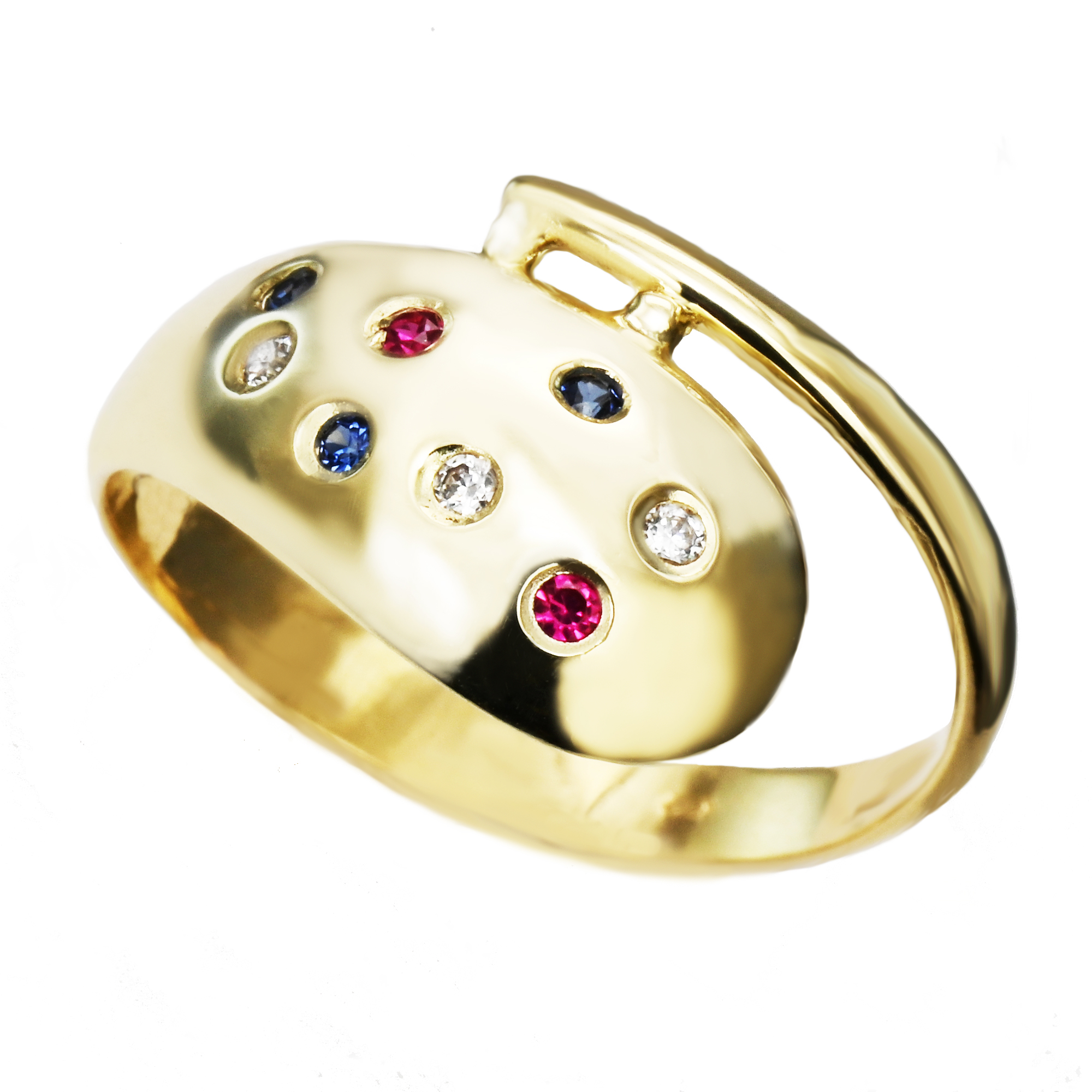 Dámský zlatý prsten ze žlutého zlata v netypickém tvaru vypouklé kapky, kterou zdobí skupina barvených zirkonů.