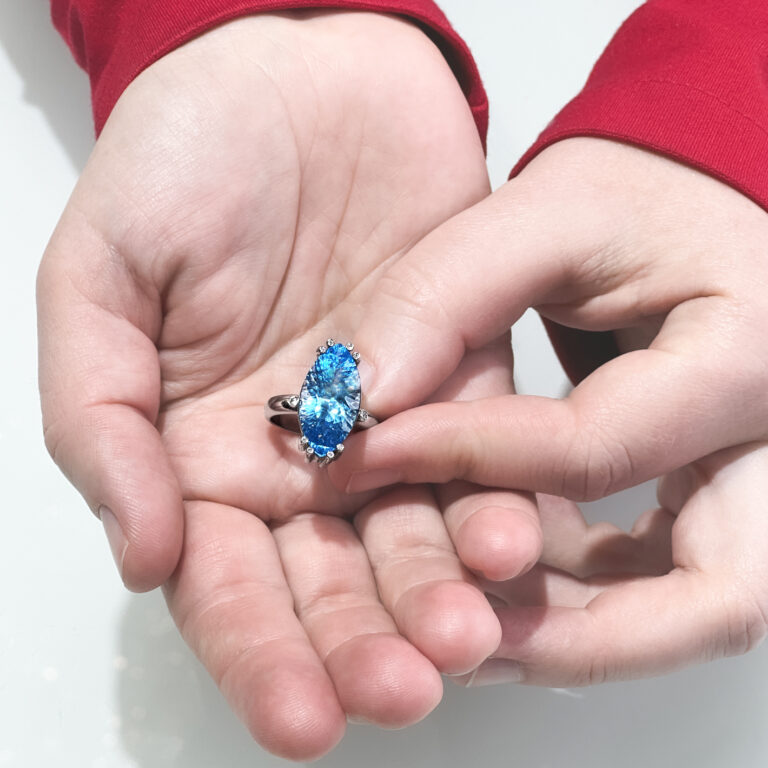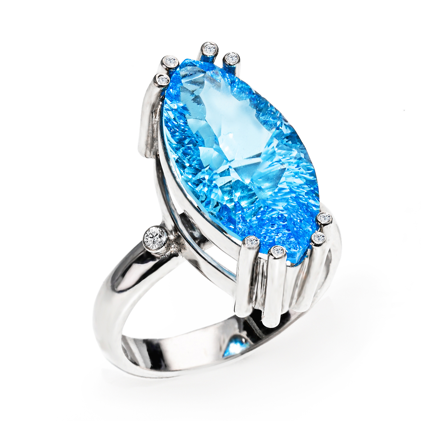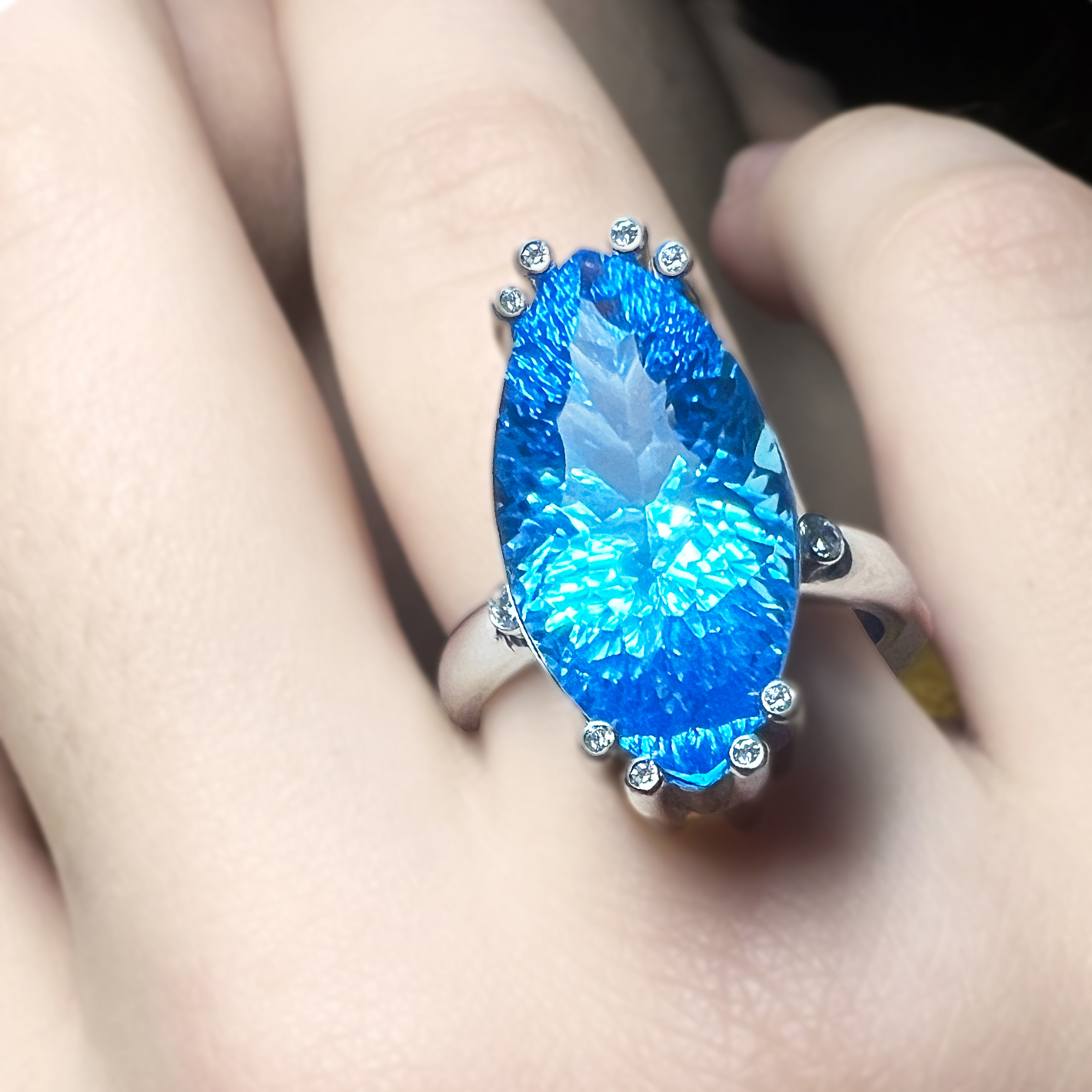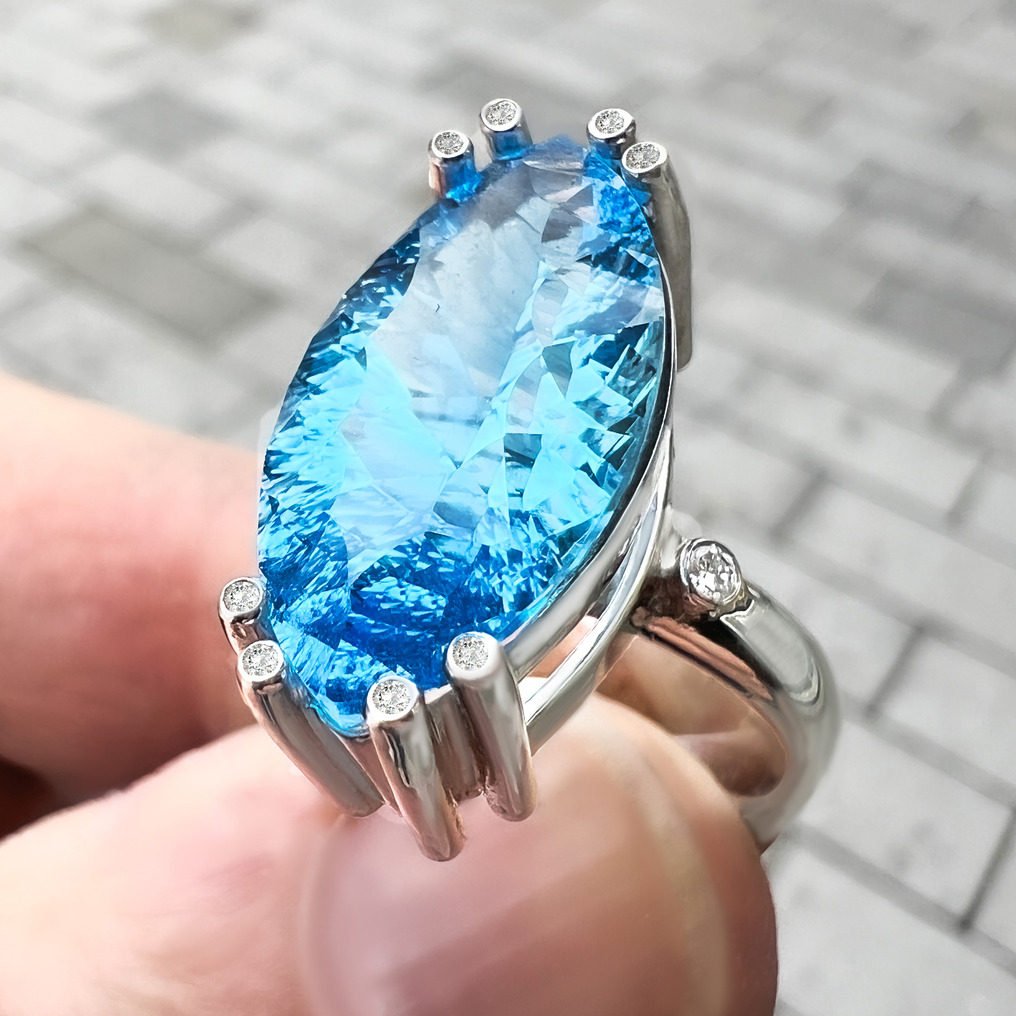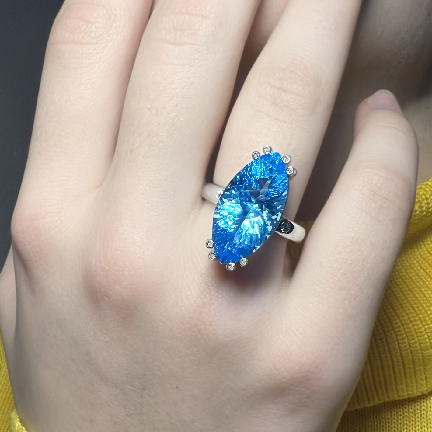 přírodní topaz 21 * 11 mm + 8 přírodních diamantů + 2 přírodní diamanty na bocích prstene