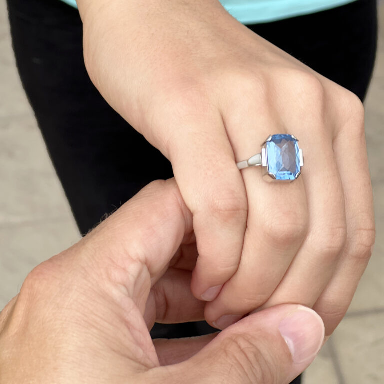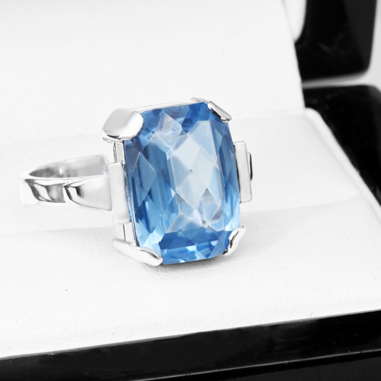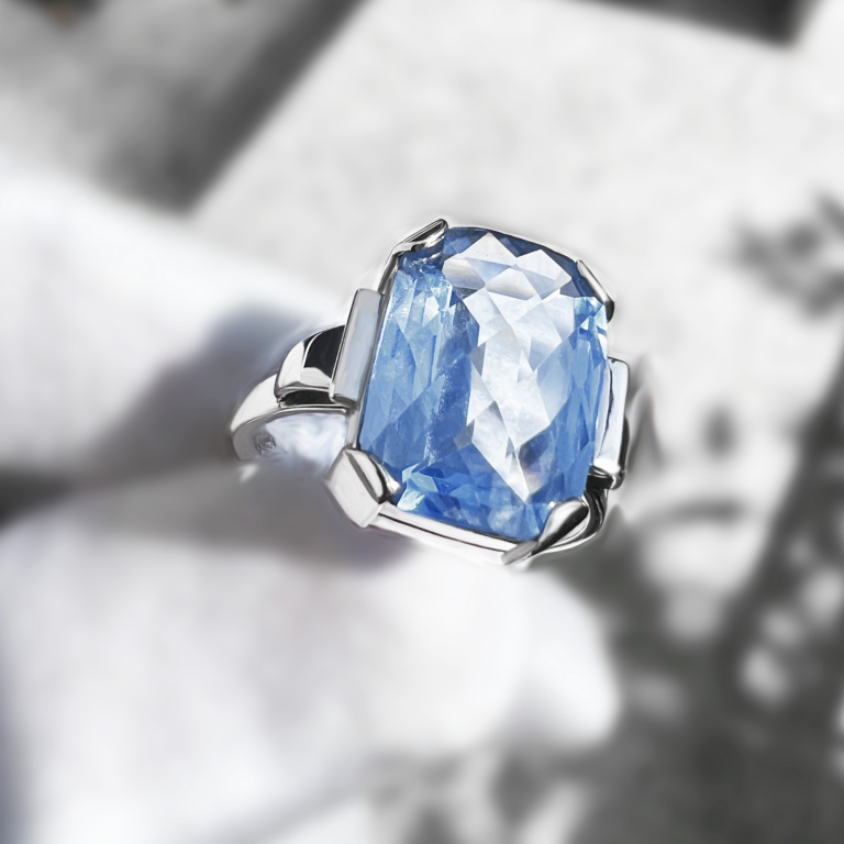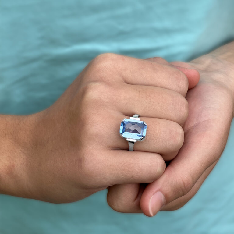 Lehký prsten z bílého zlata s přírodním akvamarínem. Ruční práce z naší zlatnické dílny.