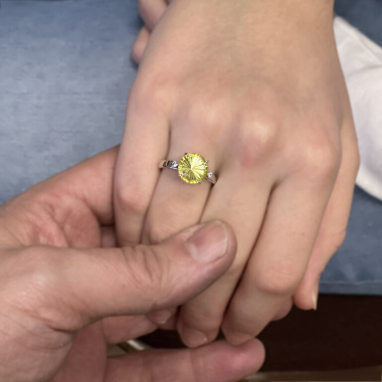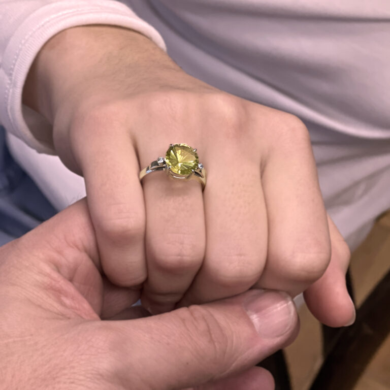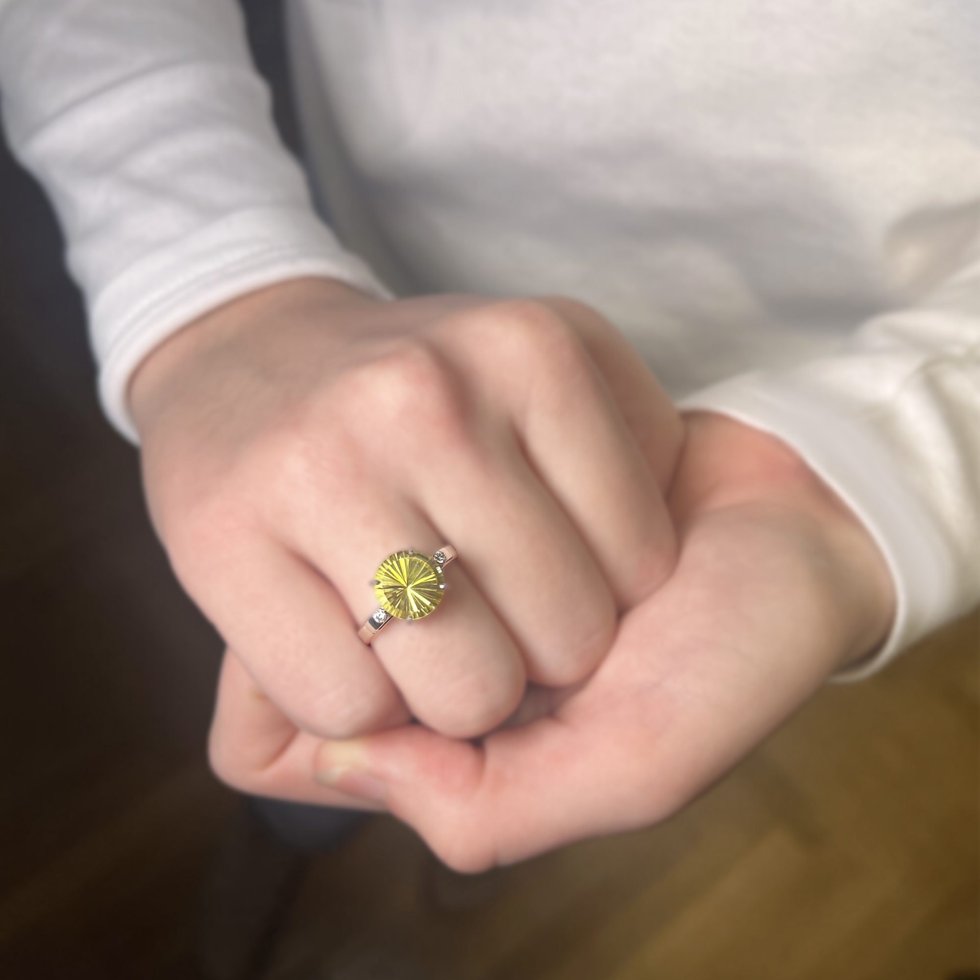 přírodní citrín v průměru 10 mm, 2 diamanty průměru 1.8 mm o celké váze 0.06 ct kvality SI1/ bílá G