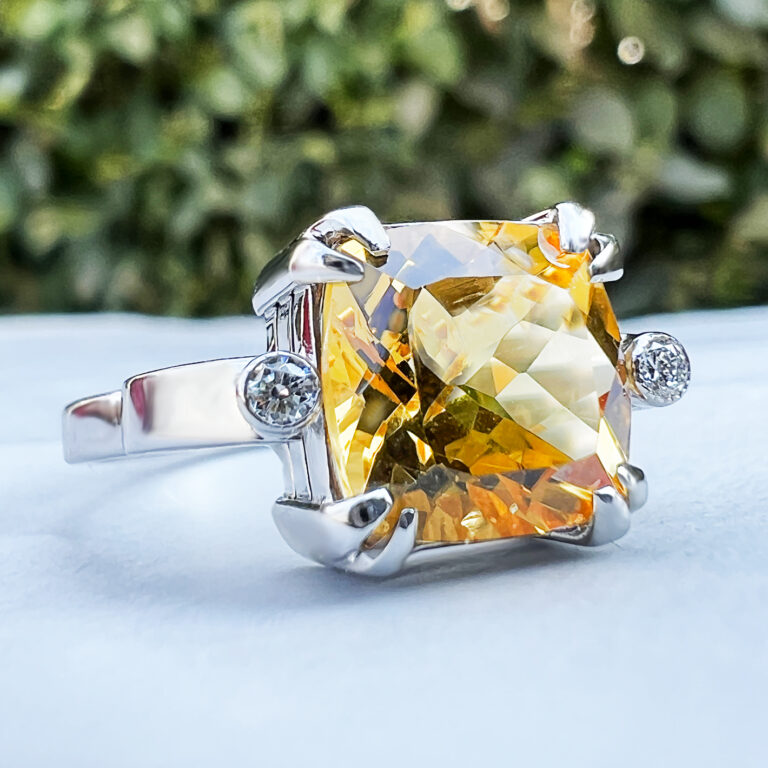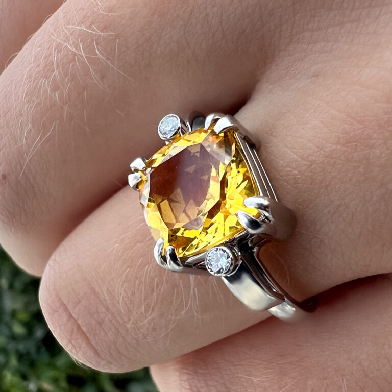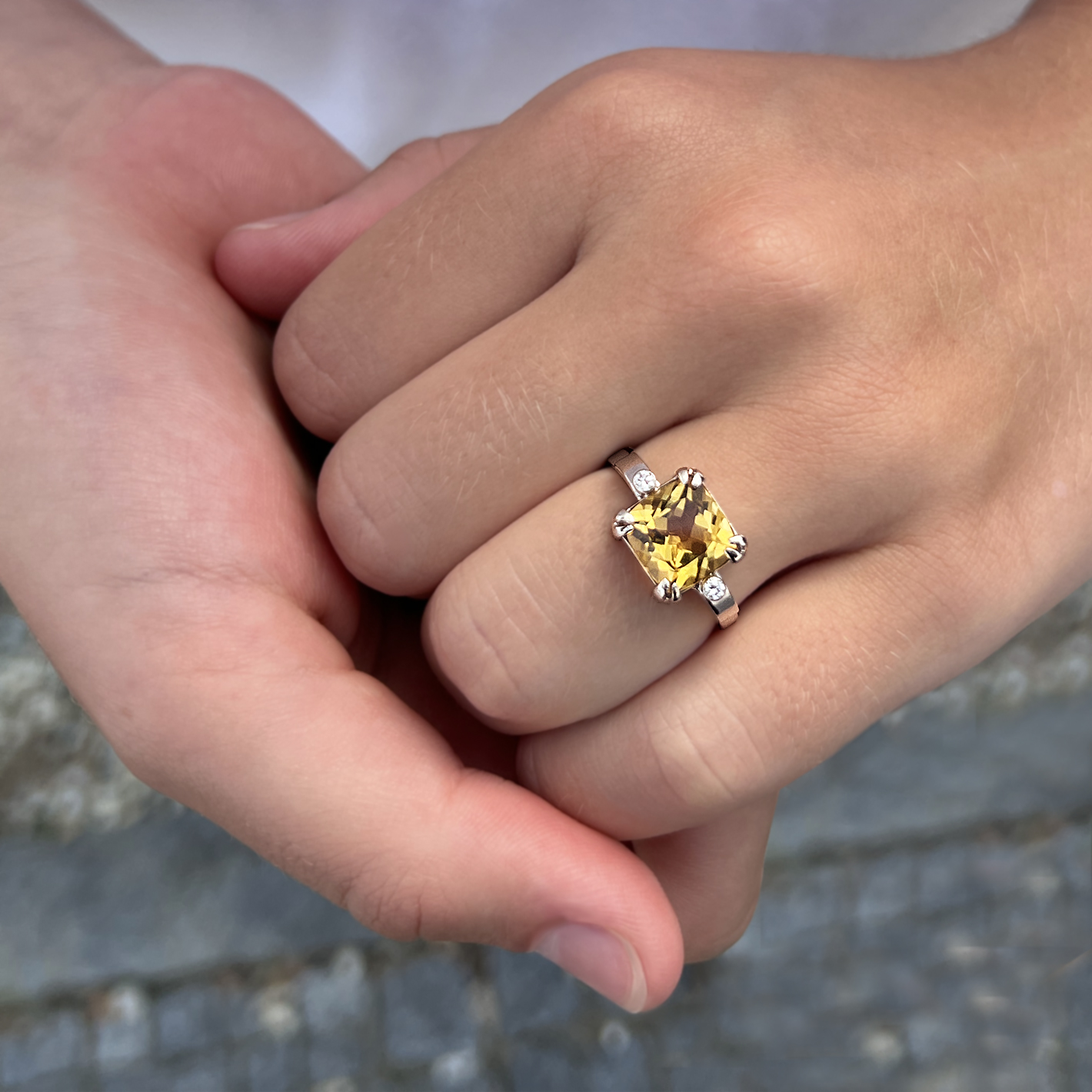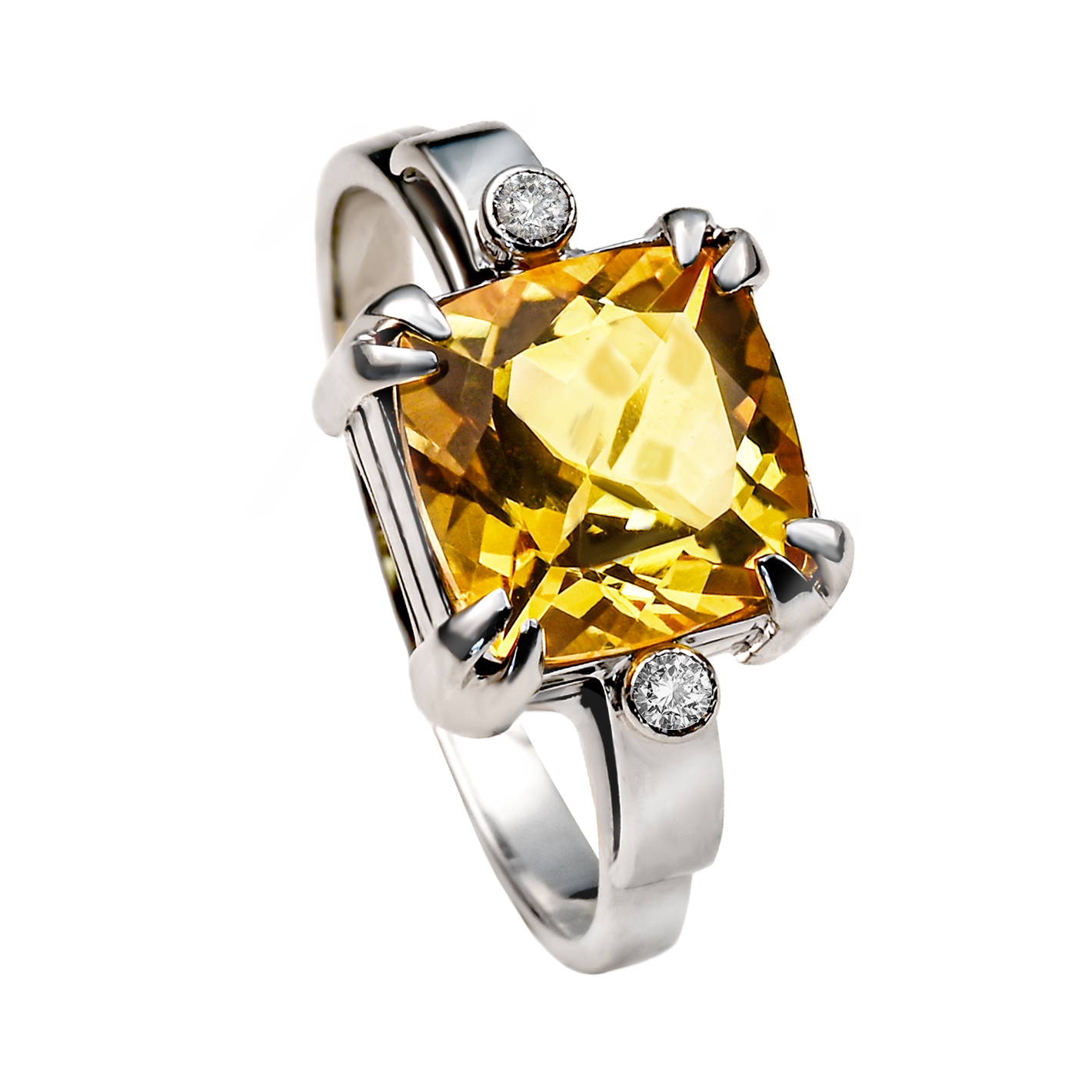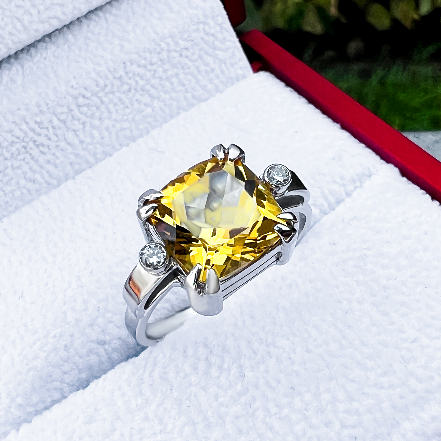Přírodní citrín medově zlaté barvy v rozměru 9.5*9.5 mm + 2 přírodní diamanty o celkové váze 0,07 ct kvality si barvy bílá G, přírodní vltavín v průměru 9 mm + 6 přírodních diamantů 0,144 ct kvality Si1 a barvy bílá G