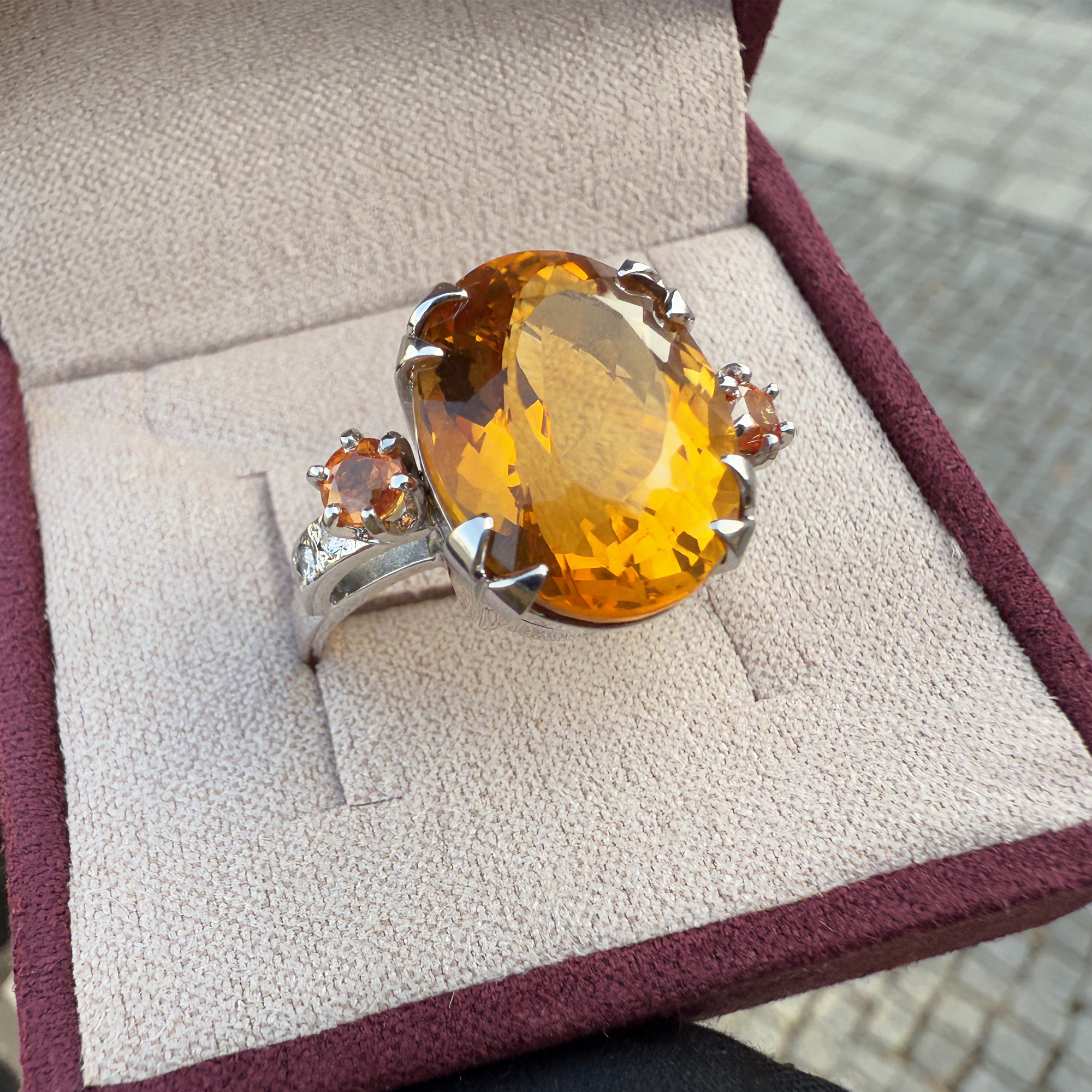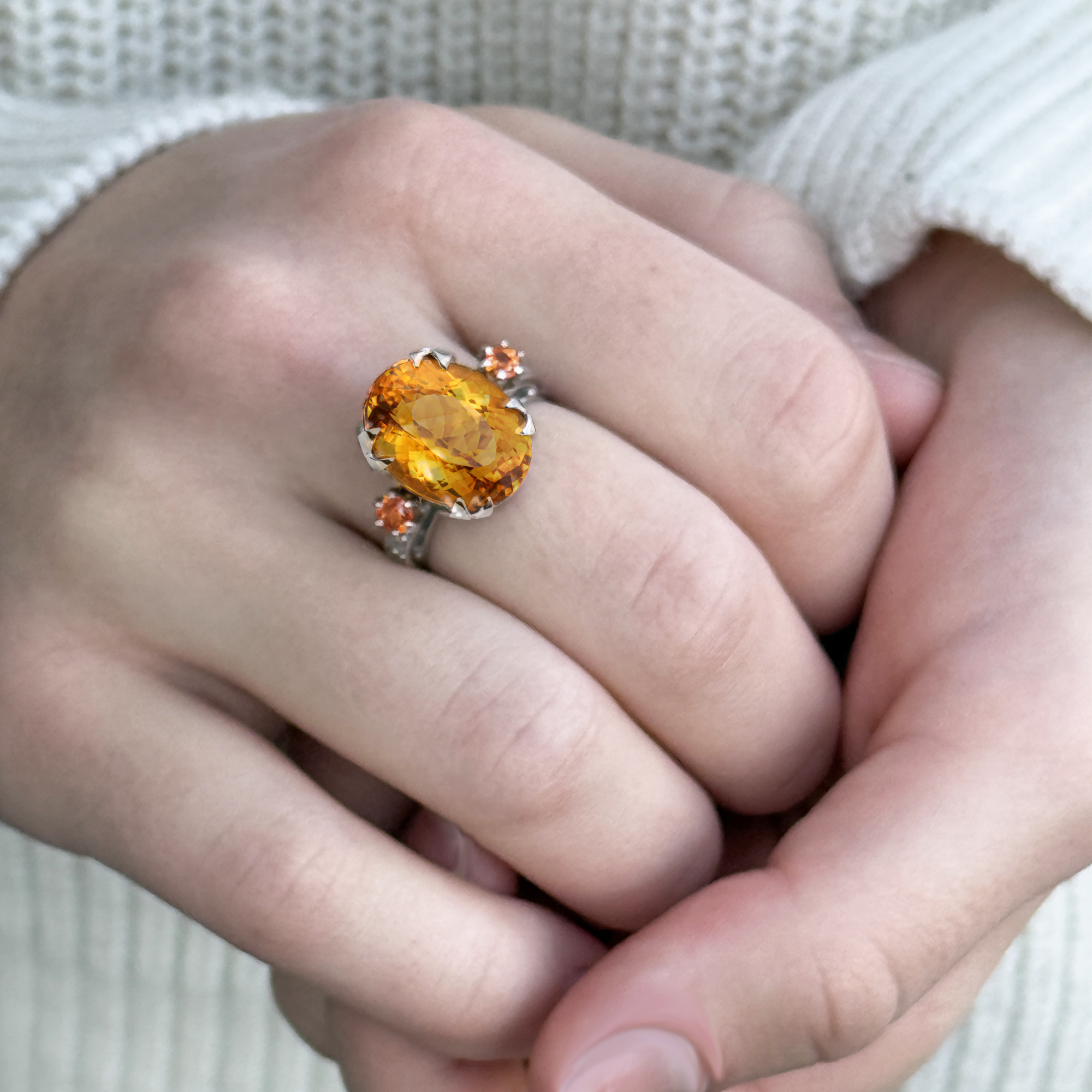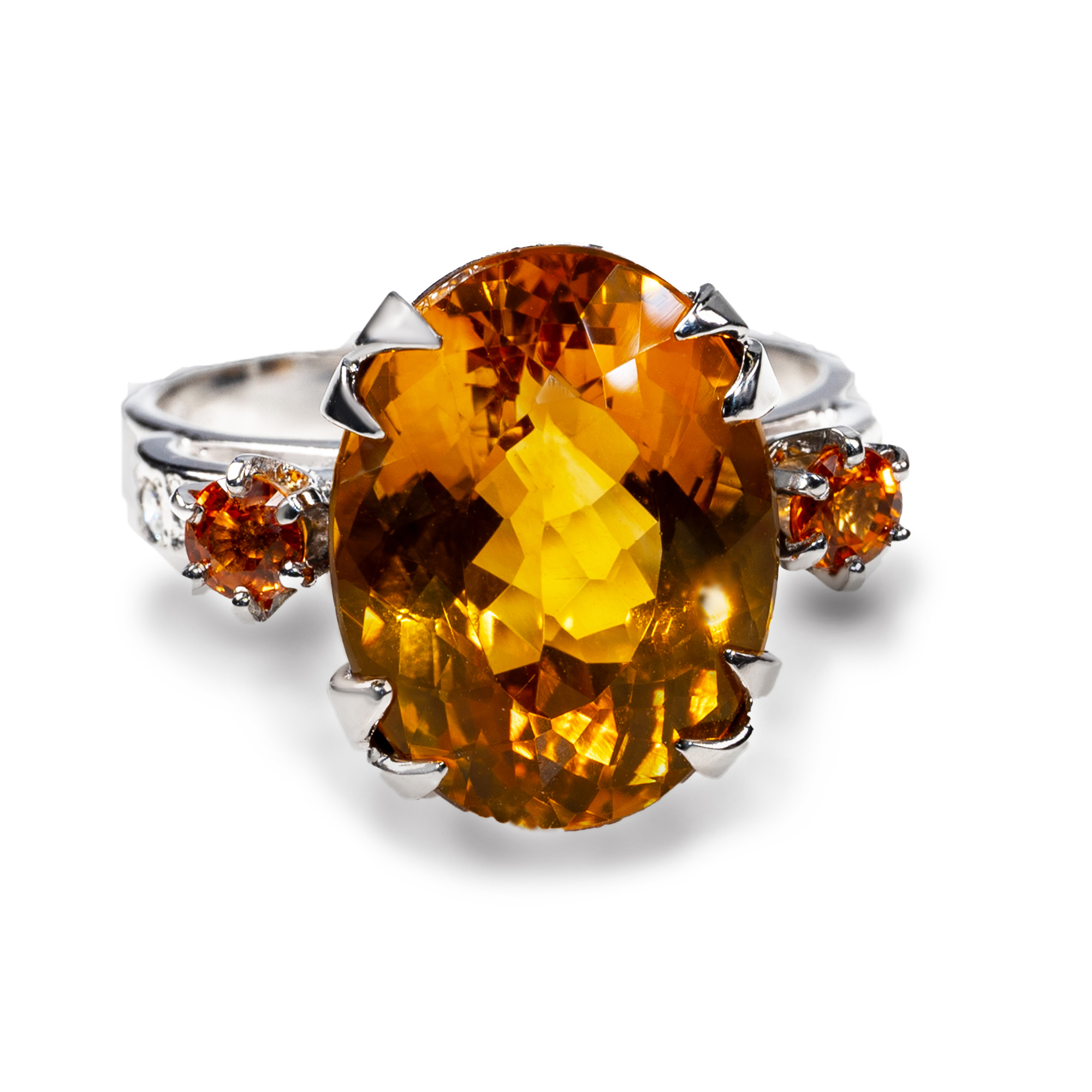 dominantní kámen je přírodní citrín v oranžově medovém odstínu v rozměru 16*12 mm. Po stranách jsou 2 přírodní oranžové safíry v průměru 4 mm. Boky doplňují 4 přírodní diamanty v průměru 1,2 mm kvality Si1, barva bílá G o celkové váze 0,096 ct