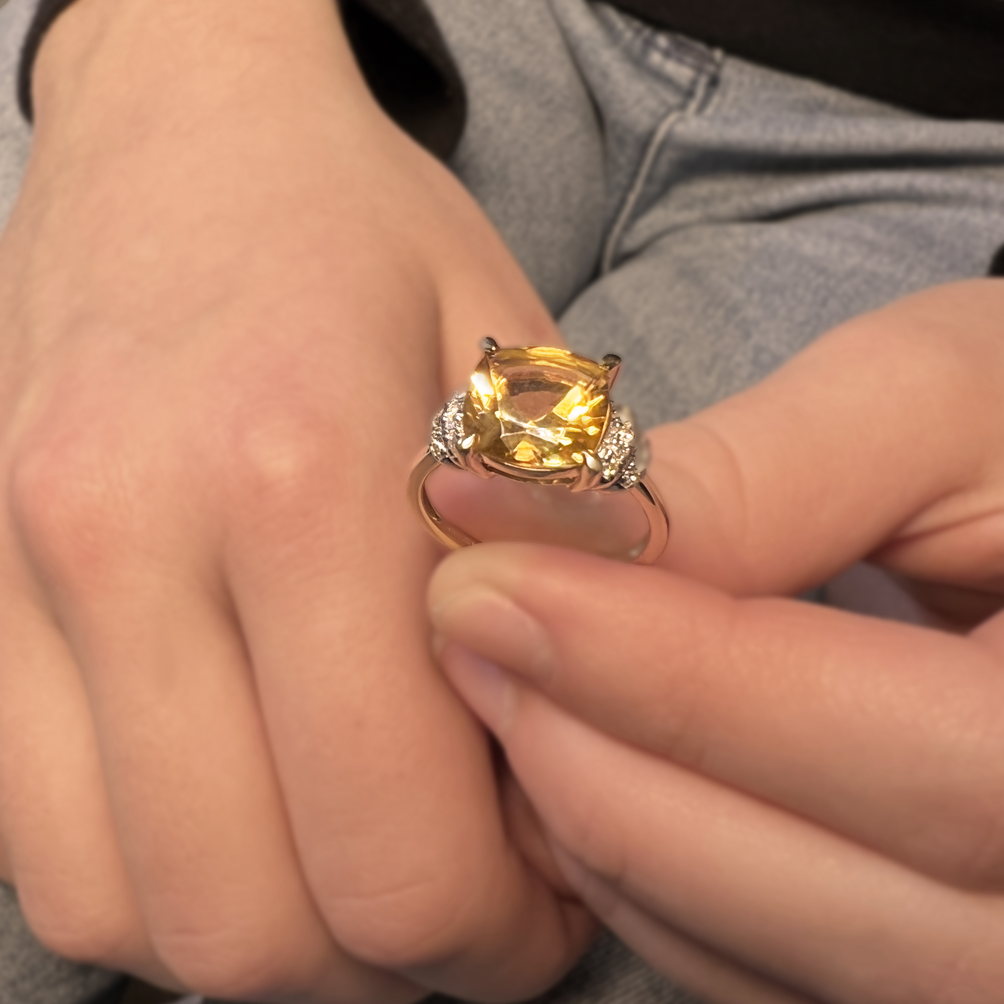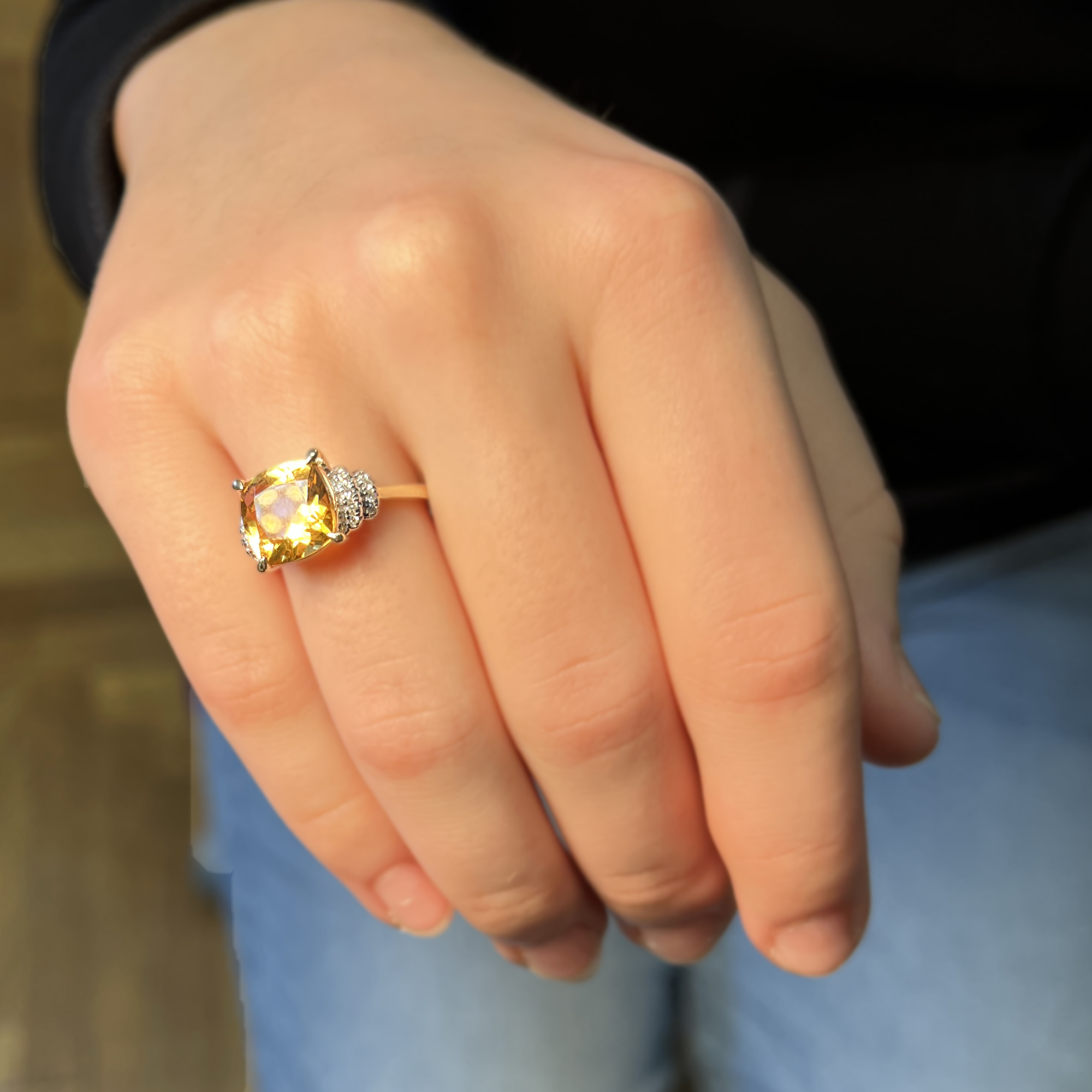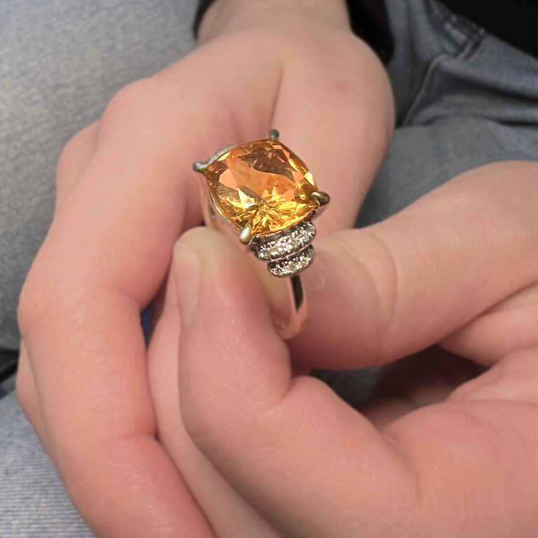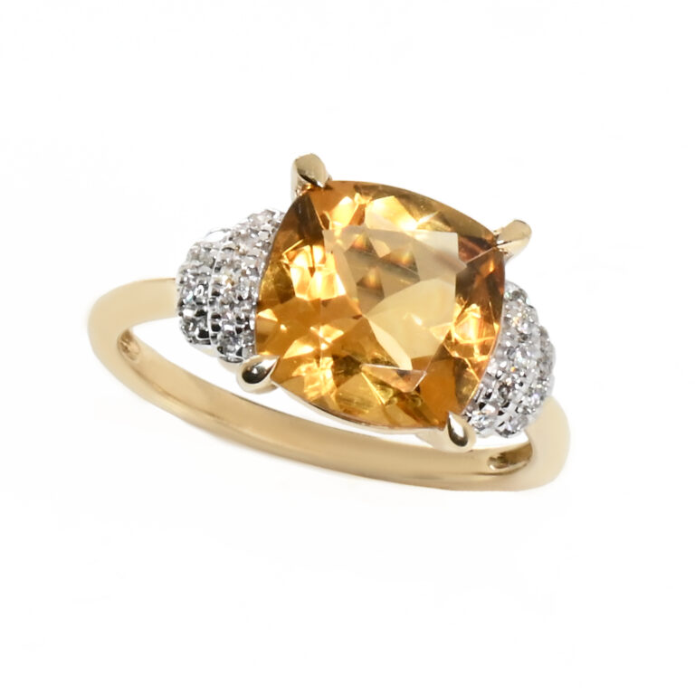 přírodní citrín medově syté barvy v rozměru 10*10 mm + 18 diamantů o celkové váze 0,12 ct barvy bílá H a kvality Si1