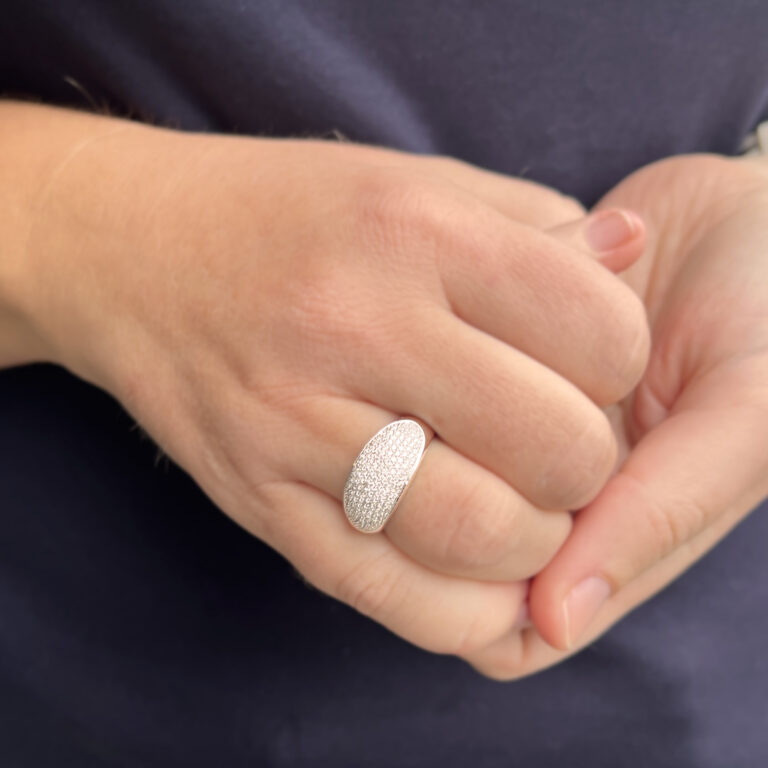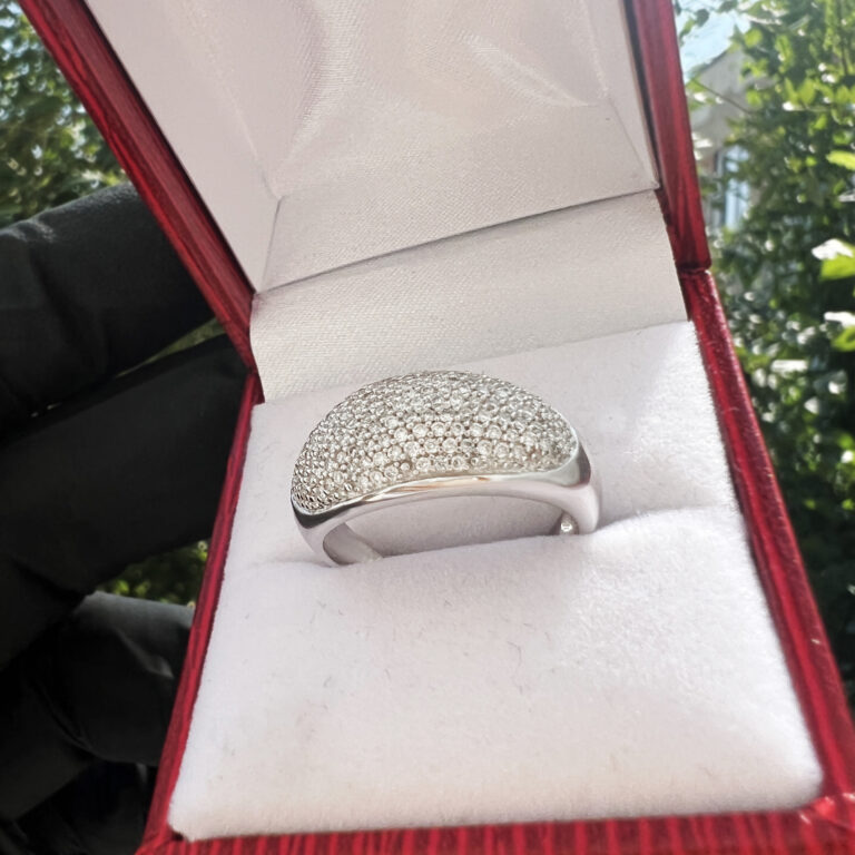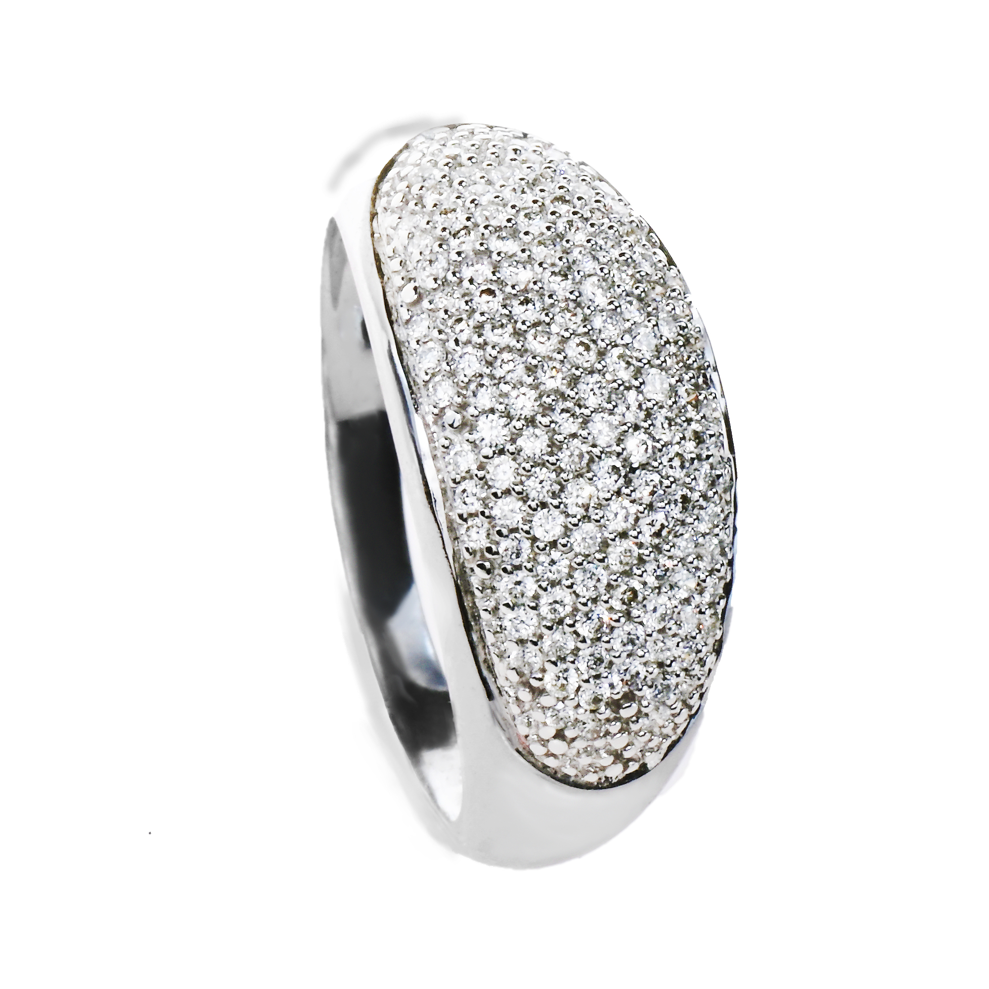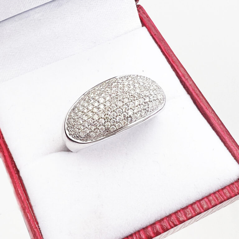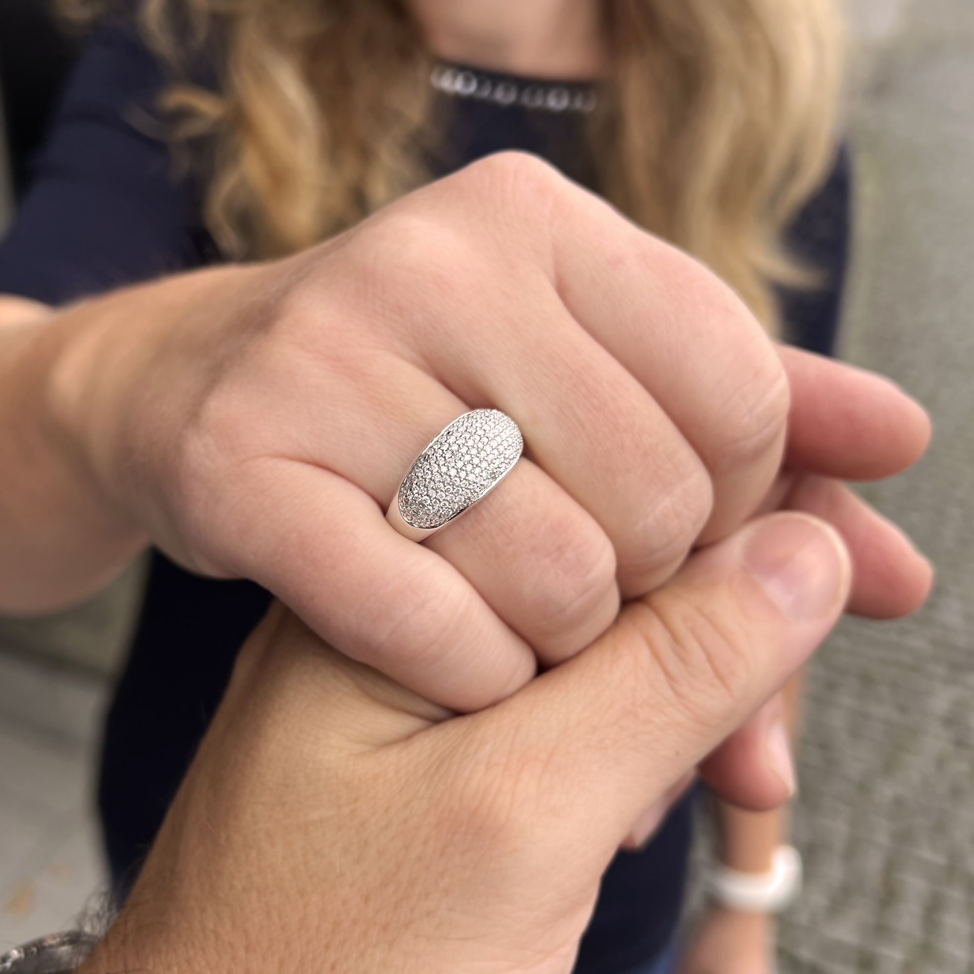 Výrazný zlatý prsten z bílého zlata bohatě zdobený diamanty.