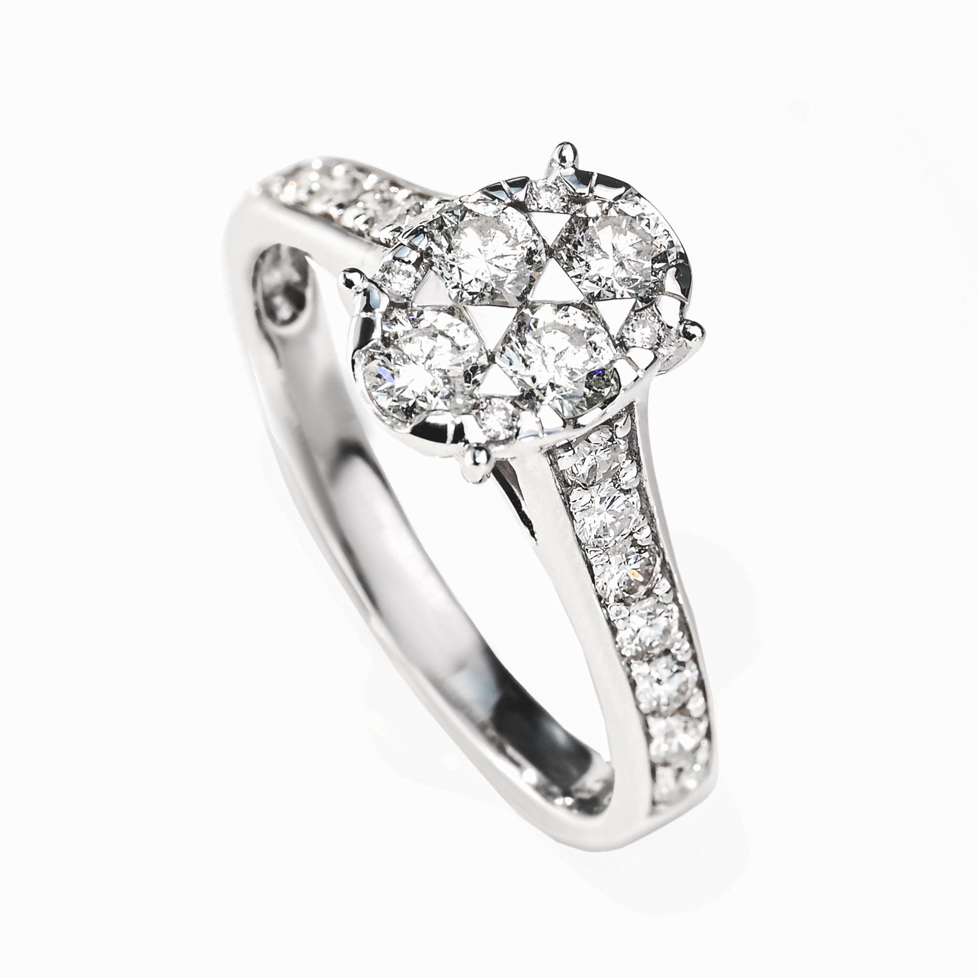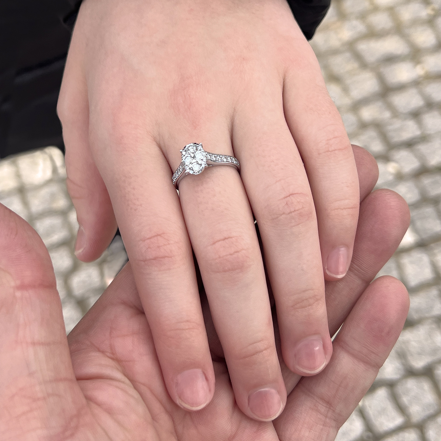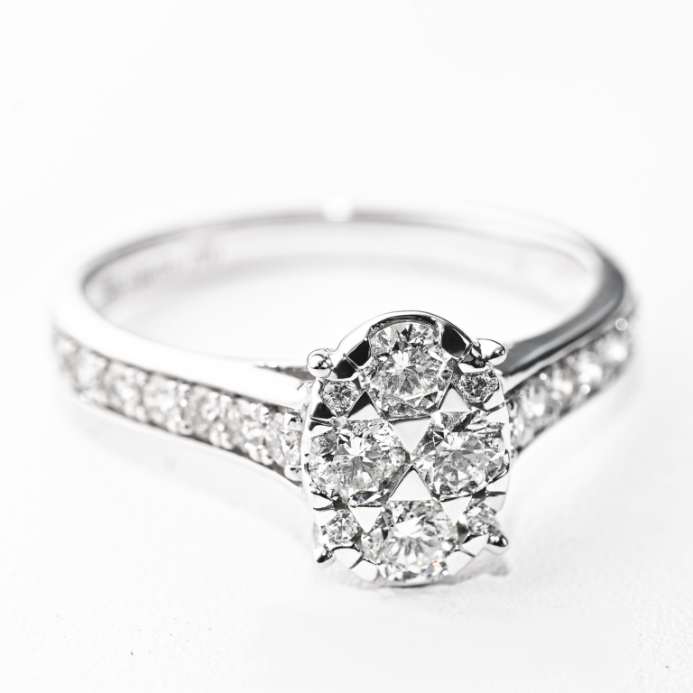celkem 22 diamantů (na čelní straně jsou 4) s briliantovým výbrusem o celkové váze 1 ct. Kvalita všech kamenů je Si1 a barva bílá G