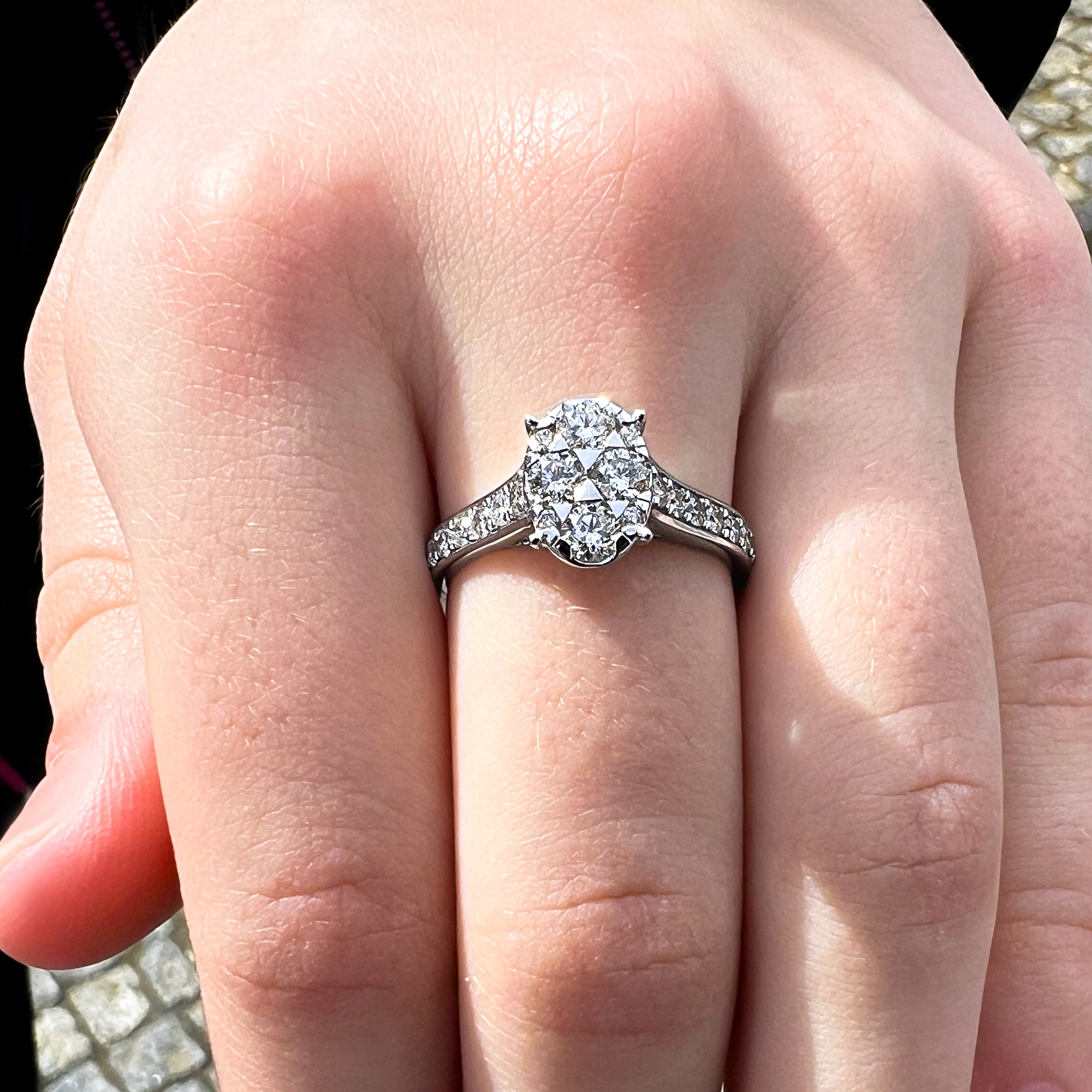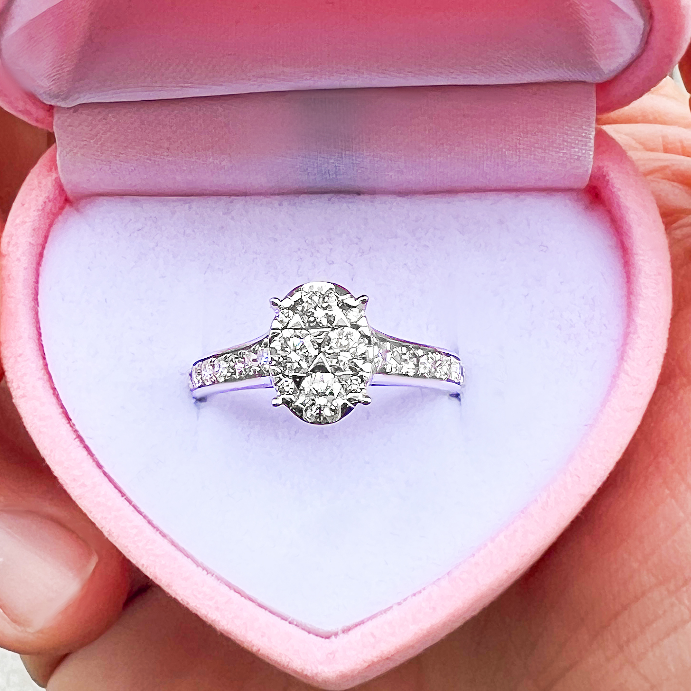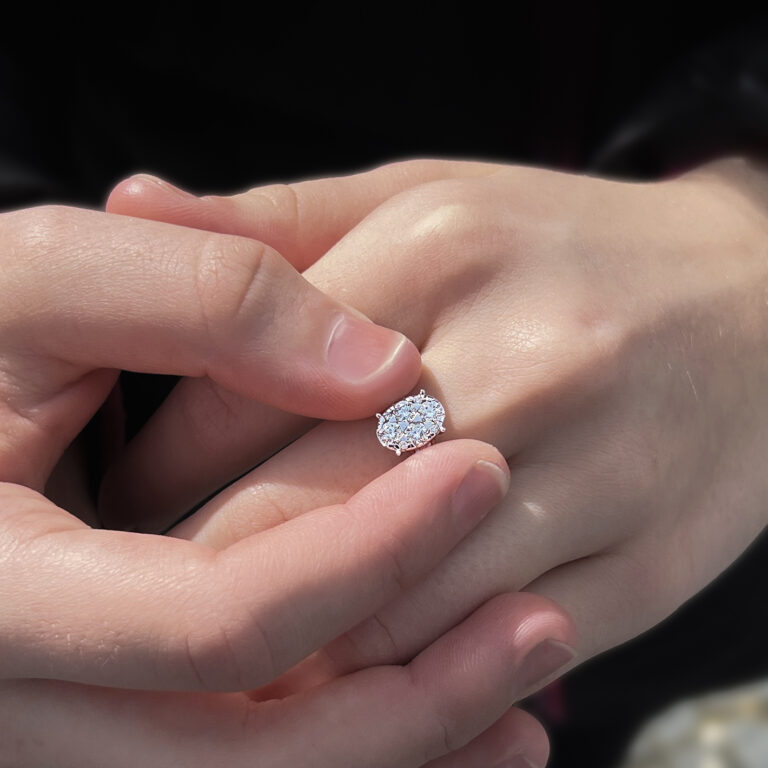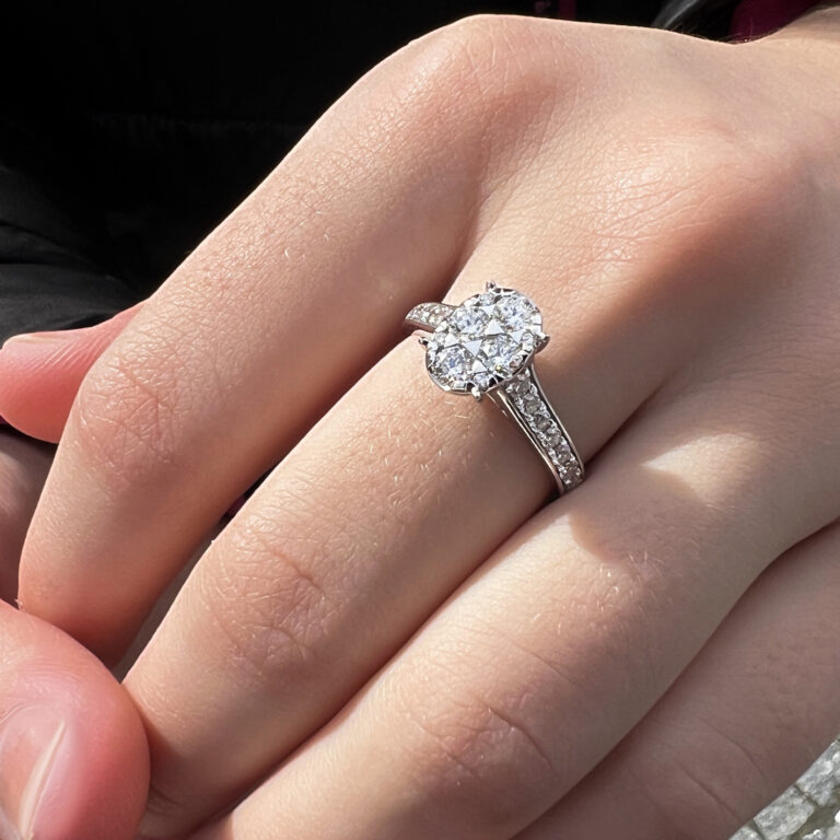 celkem 22 diamantů (na čelní straně jsou 4) s briliantovým výbrusem o celkové váze 1 ct. Kvalita všech kamenů je Si1 a barva bílá G