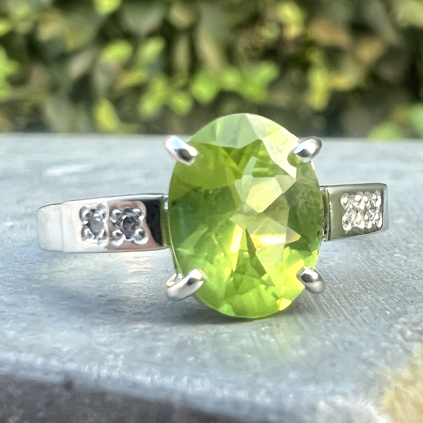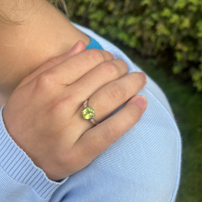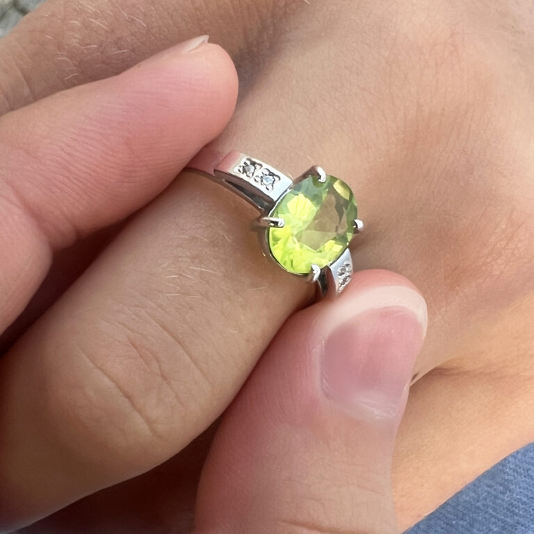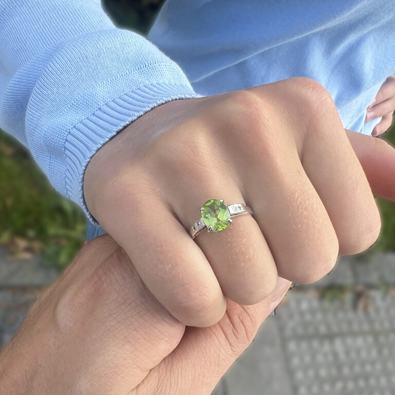 přírodní olivín v rozměru 9*7 mm + 4 syntetické zirkony