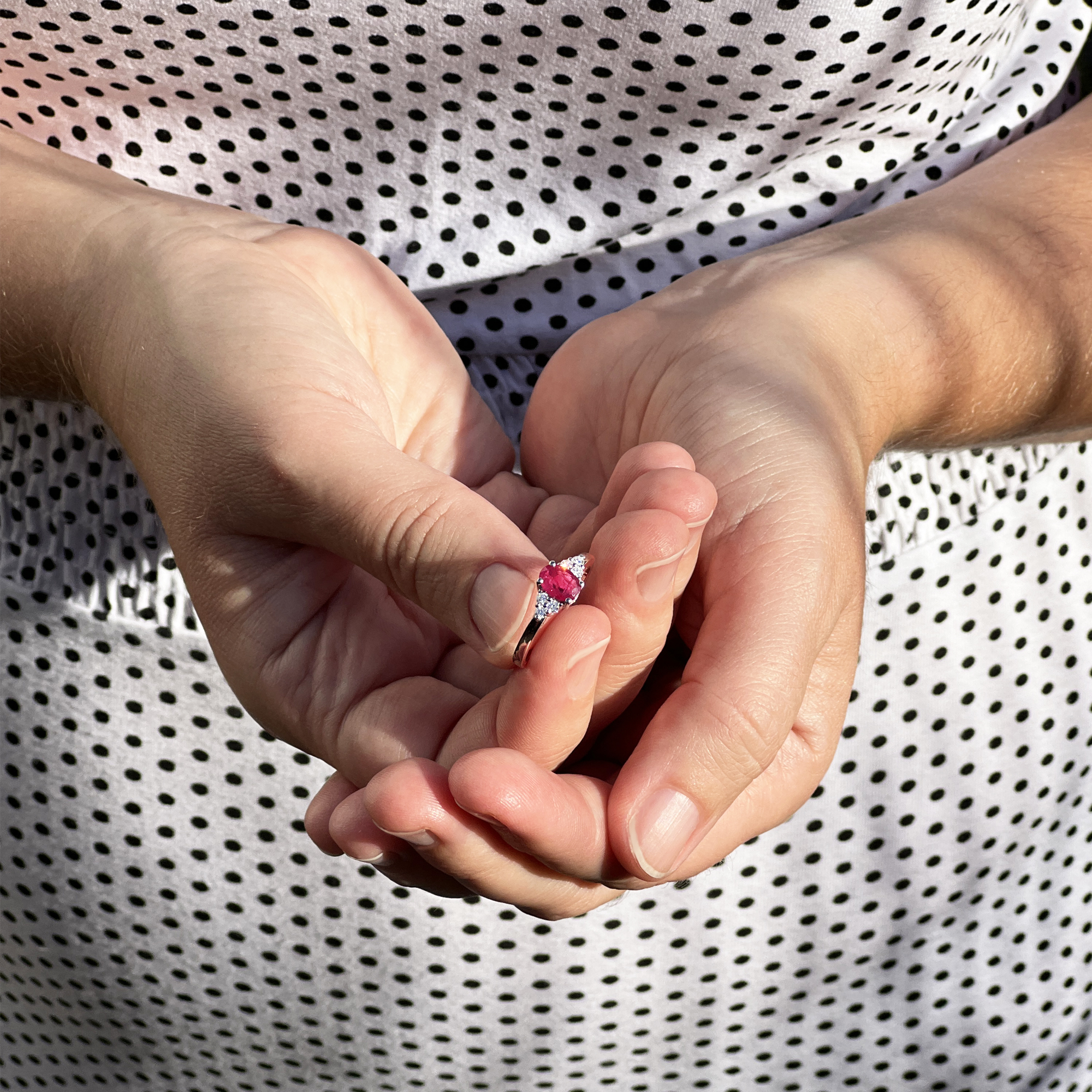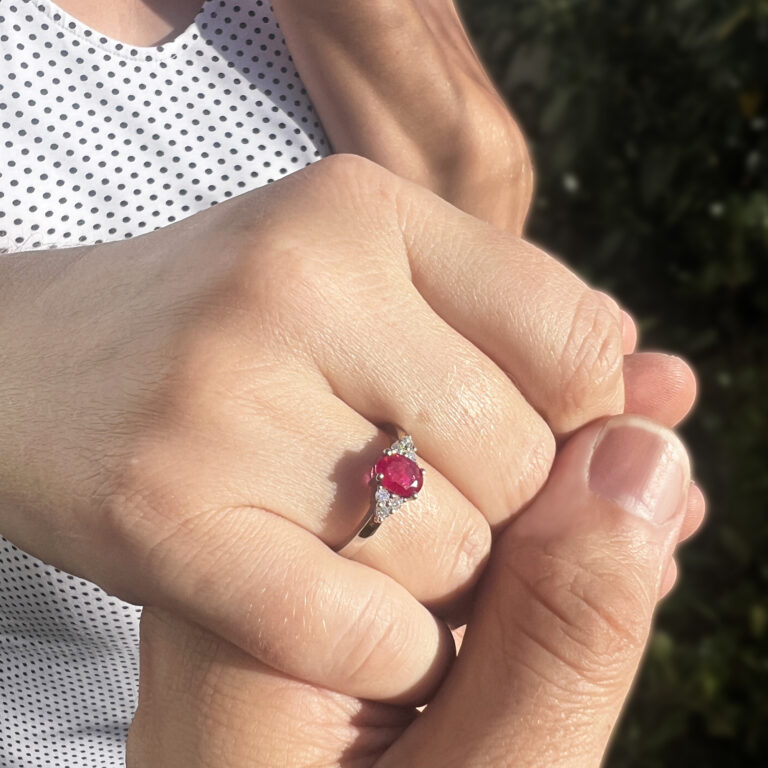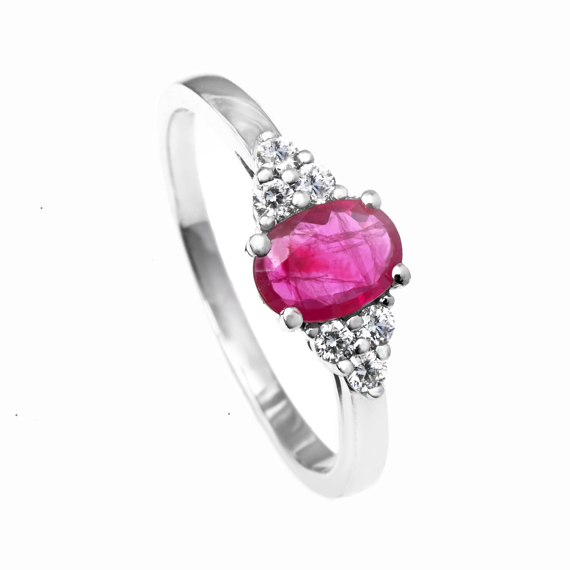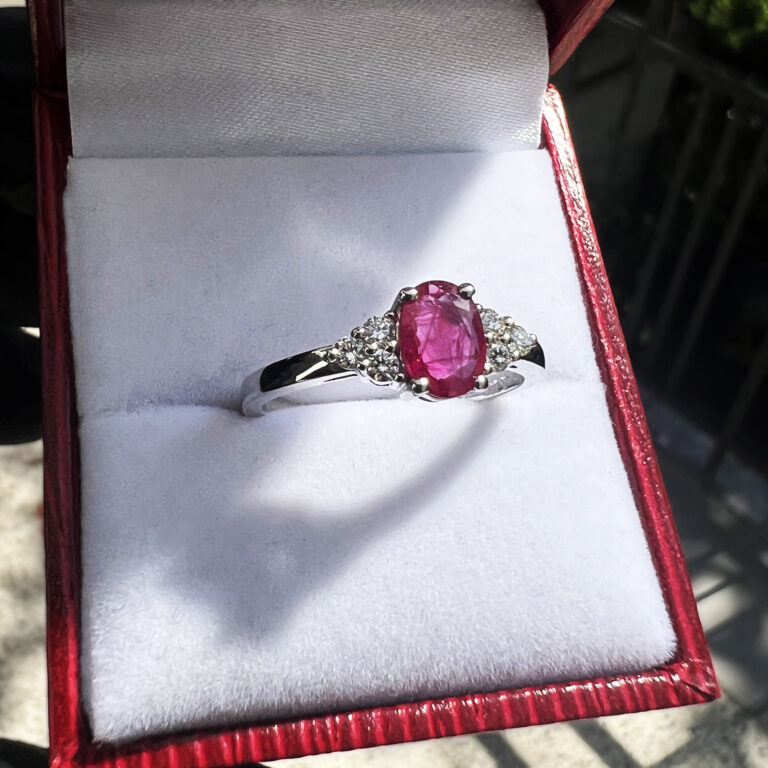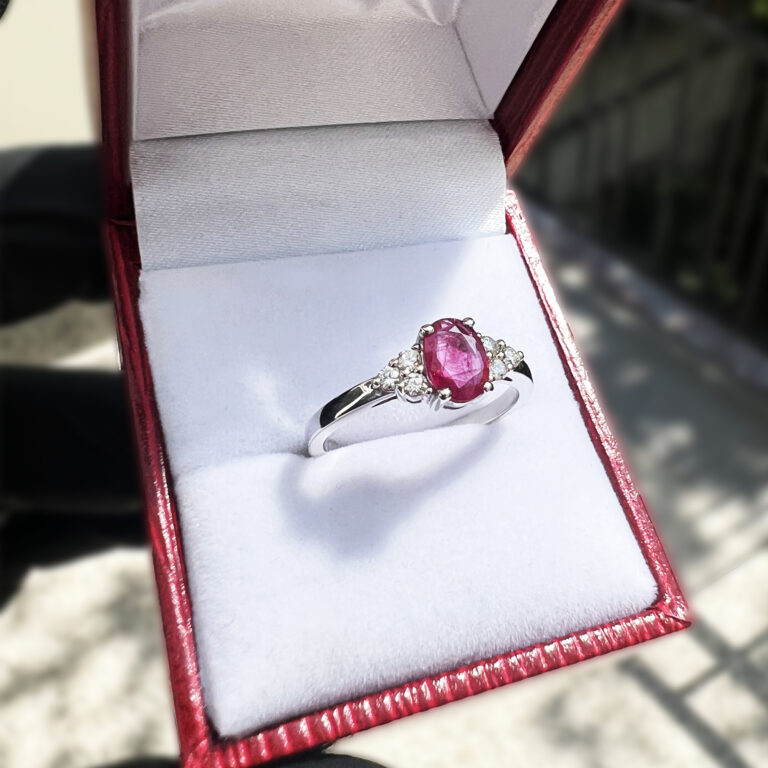 Rubínový prsten s diamanty v bílém zlatě.