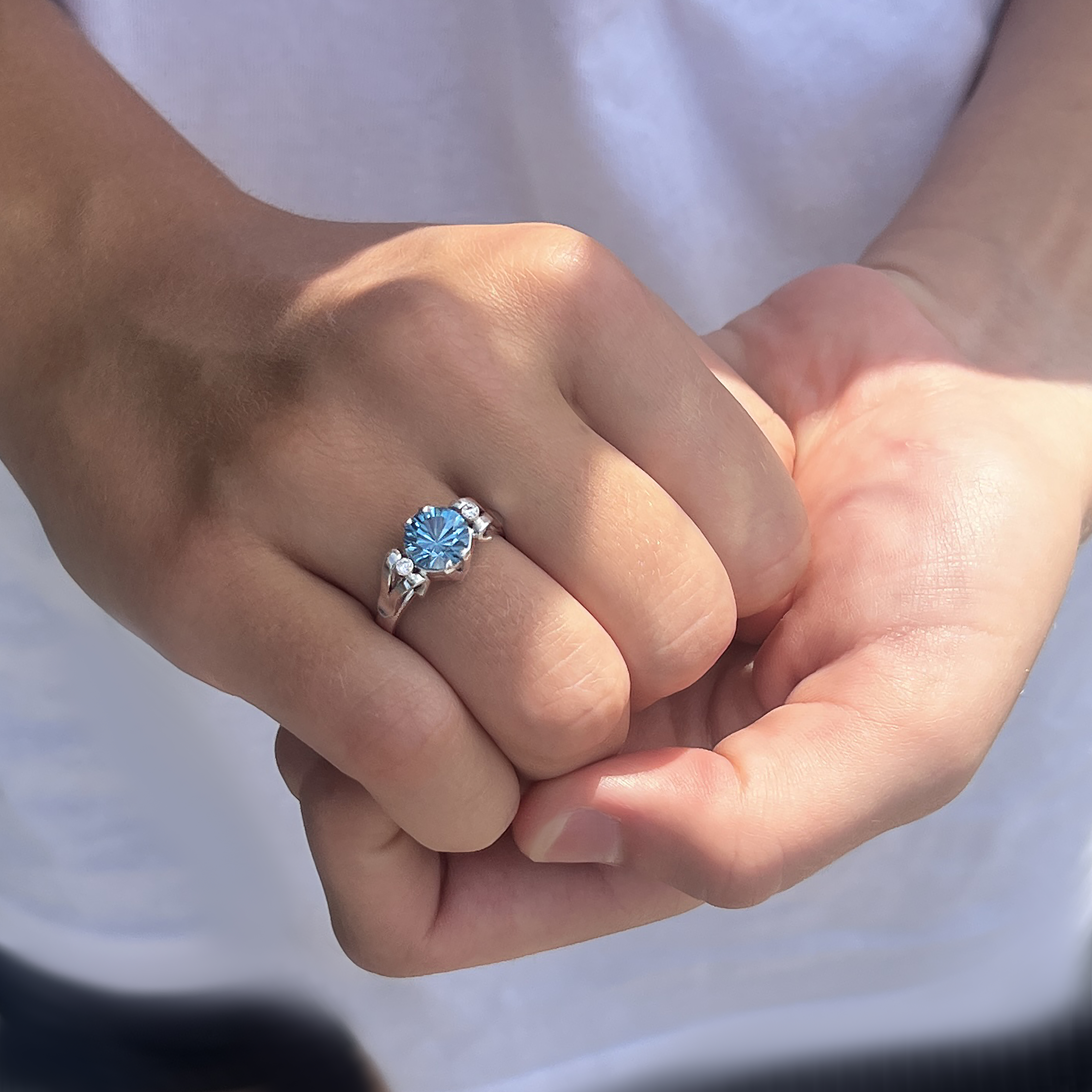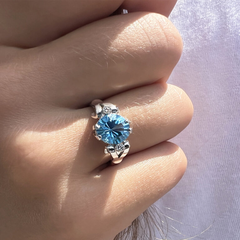 Tento topazový prsten jsem pro jeho atypický paprskovitý brus usadil do bohatě zdobeného prstene. Jemné detaily uchycení diamantů, vlny spojující obrubu a uchycení boků společně vytváří vizuálně zajímavý celek. I přes množství tvarů se nejedná o velký šperk, ale ve finále je to originální a zajímavý prsten.