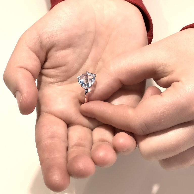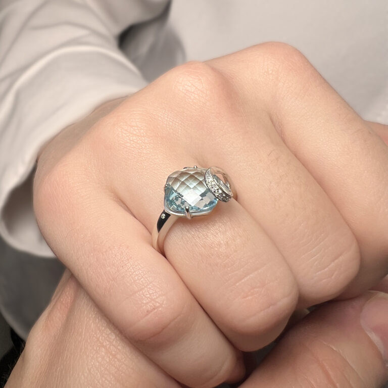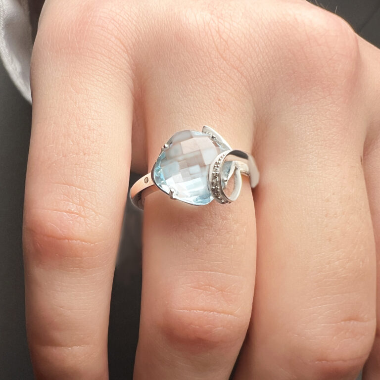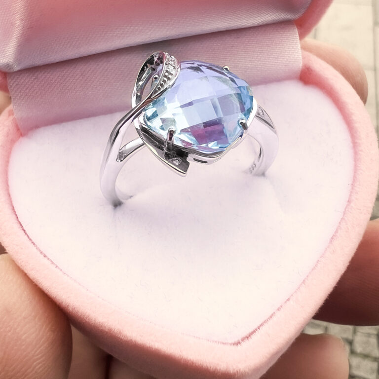 přírodní topaz světle modré barvy, šachovnicový brus, rozměry 10*10 mm + 8 přírodních diamantů o celkové váze 0,03 ct kvality Si1 barvy bílá H