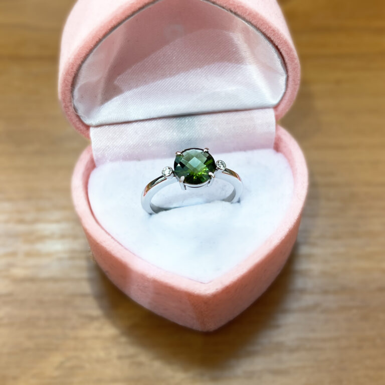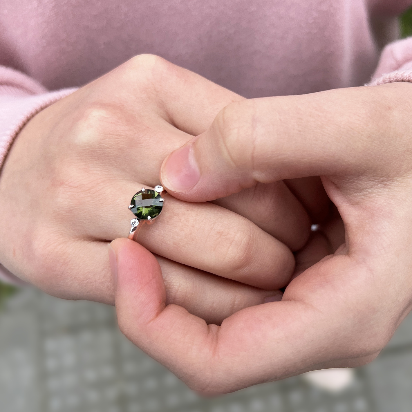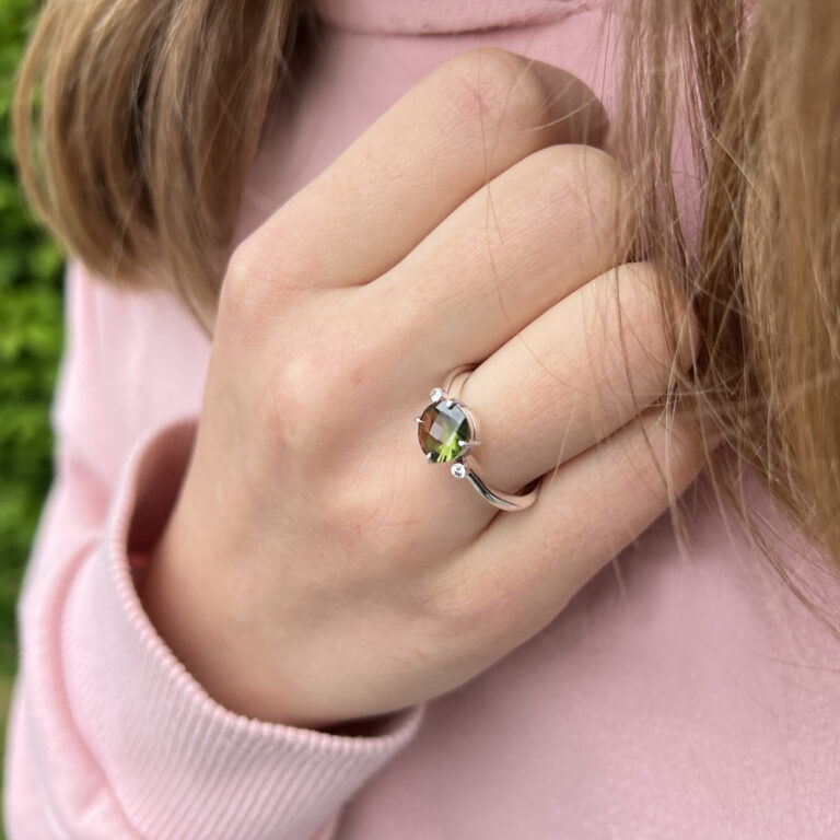Vltavíny ve spojení s bílým zlatem fungují fantasticky. Temná lahvově zelená ve spojení se zářivě bílou je skvělá barevná kombinace a 2 diamanty po stranách svým třpytem jen zvýrazní odlesk vltavínu. Osobně mám rád vltavíny, kde je vidět ten proces a uvnitř kamene jsou bublinky, vrostlice a jemné zlomy, které vytváří víc než 50 odstínů zelené.