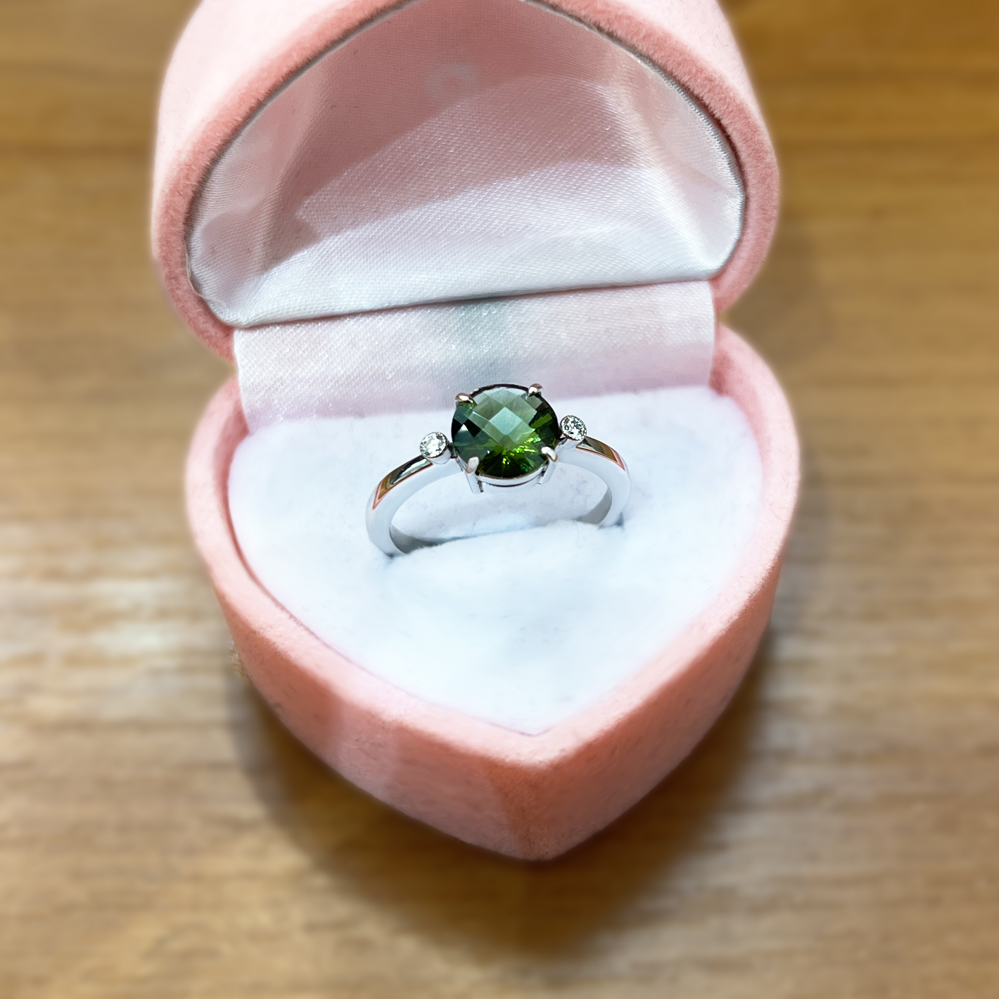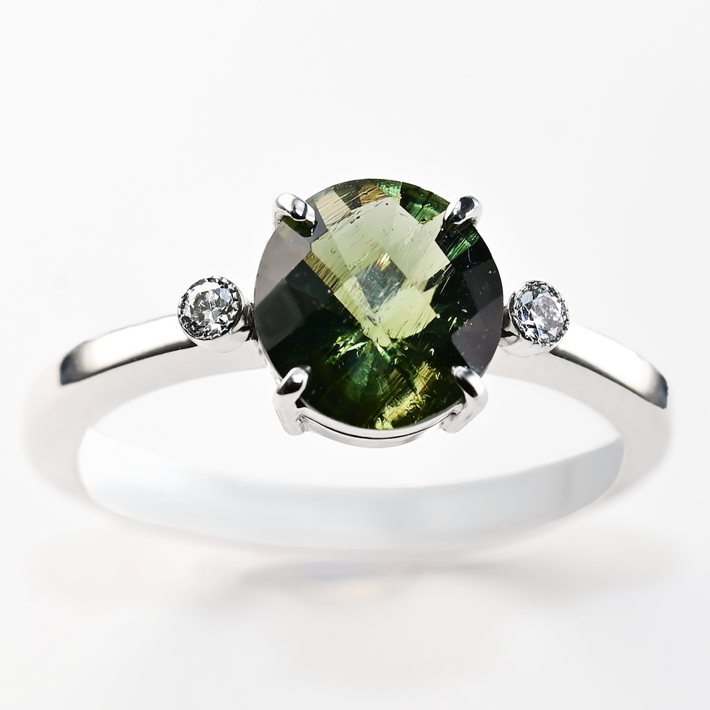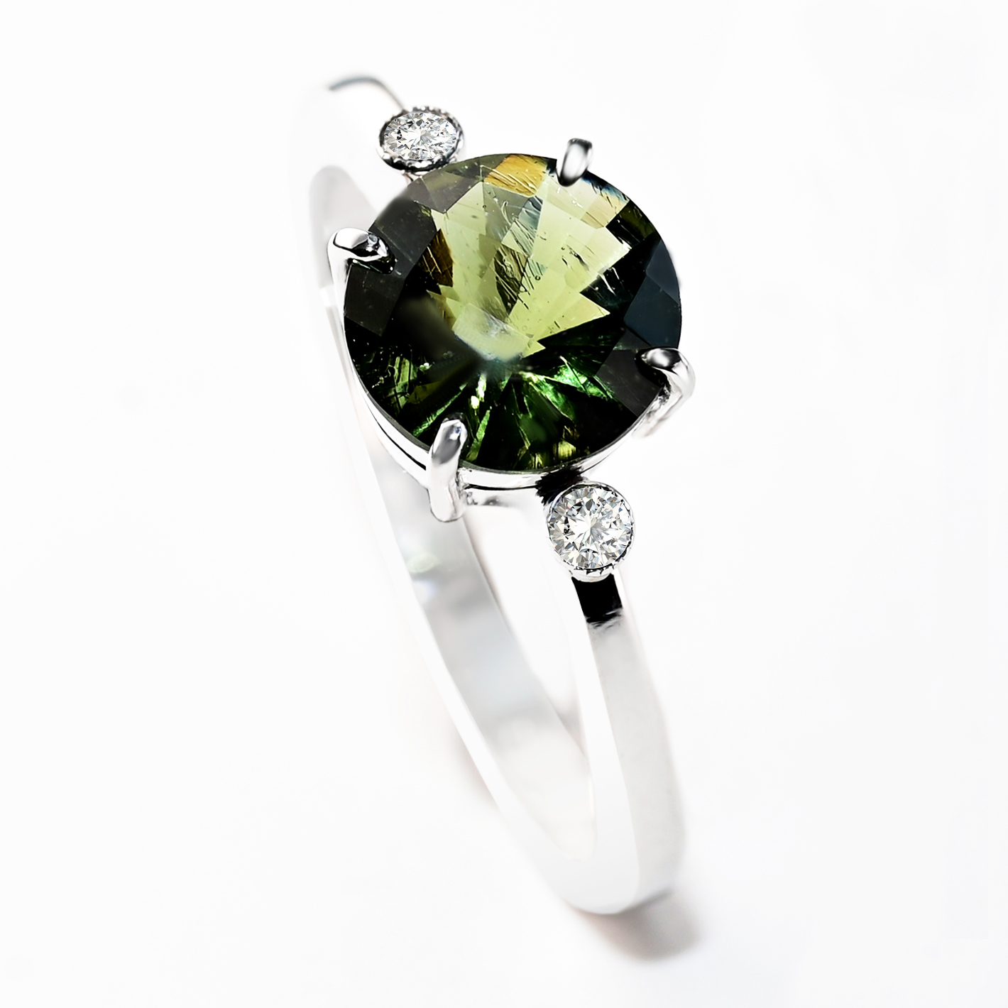 přírodní vltavín průměru 8 mm + 2 diamanty o celkové váze 0.050 Ct SI1/G
