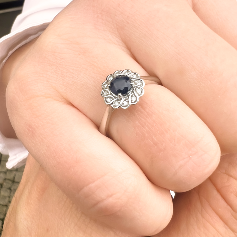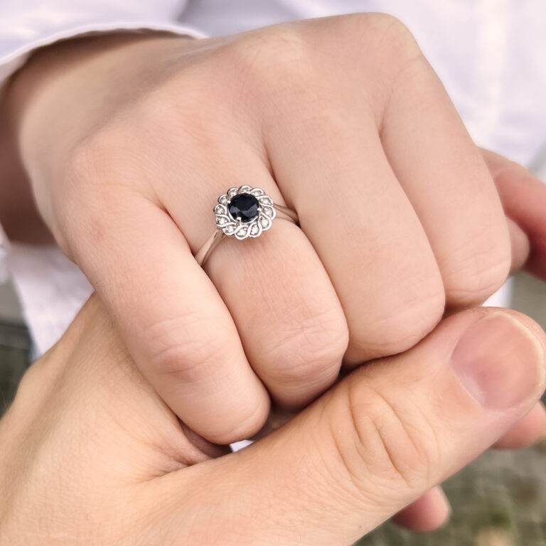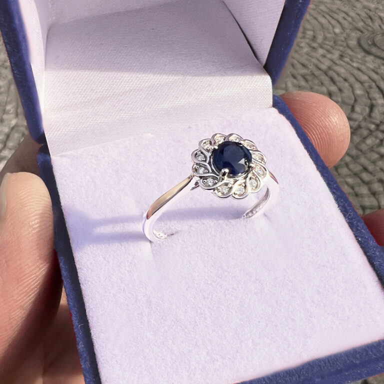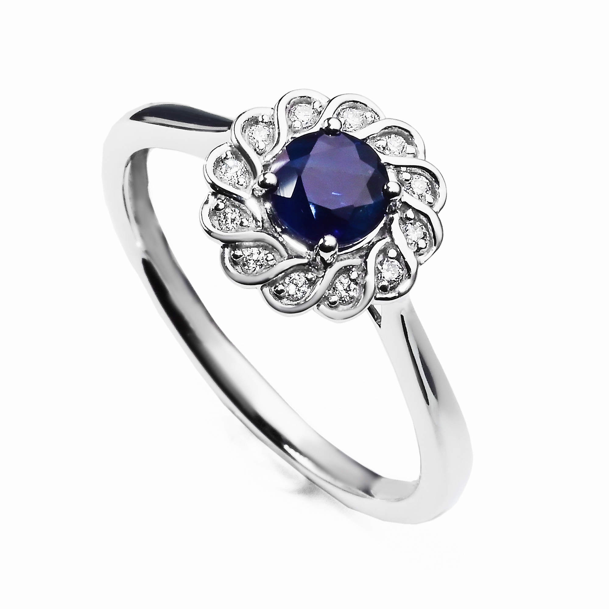 přírodní safír v průměru 5 mm + 12 diamantů v celkové váze 0,06 ct kvality Si1 barva bílá G