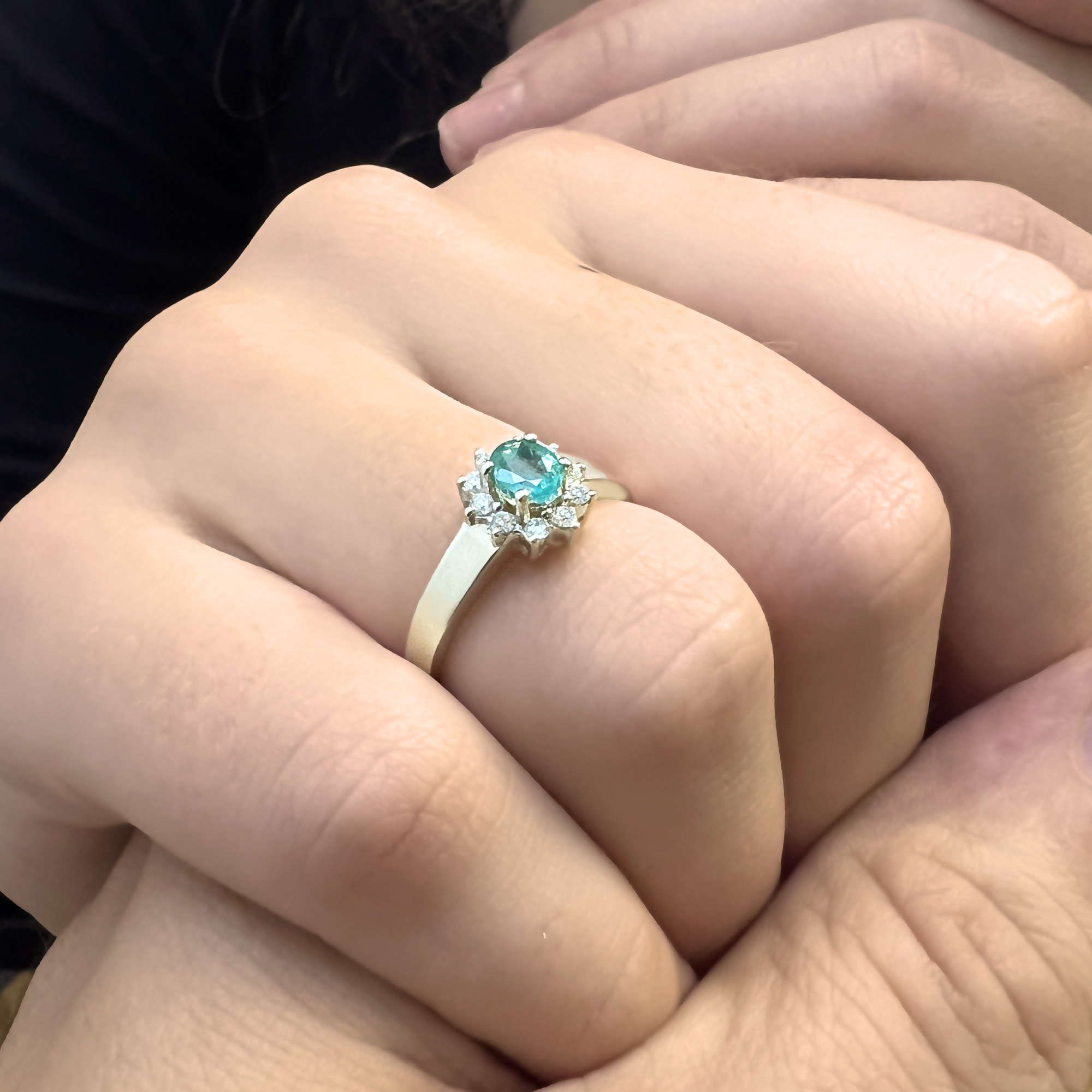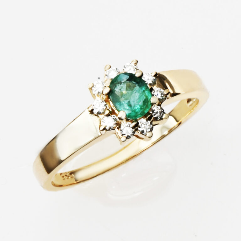"Ozvláštněte své chvíle něčím výjimečným – naším zlatým prstenem s oválovým smaragdem a třpytem deseti okouzlujících diamantů. Tento klenot ze žlutého zlata není jen šperk, je to vyjádření elegance a decentního luxusu. Oválný smaragd, jako zelený poklad, je obklopen desítkou diamantů, které září jako hvězdy na noční obloze. Pro ženu, která ocení jedinečnost a vkus, je tento prsten ideálním doplňkem pro každou příležitost. Objednejte si tento klenot a dejte svému stylu nádech krásy a noblesy." viditelnými vrostlicemi