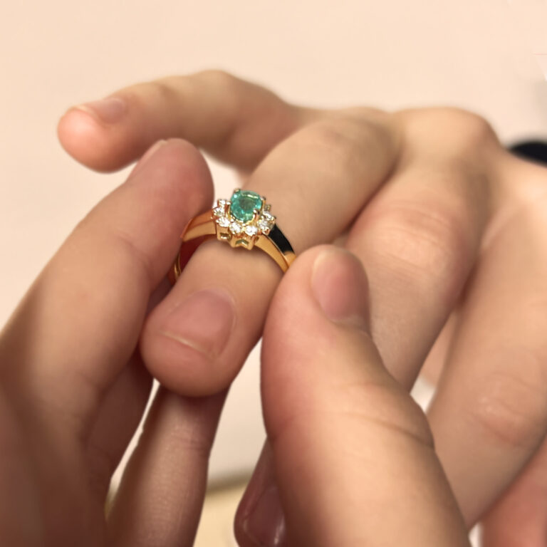 Jemný zlatý prsten se smaragdem a diamanty.