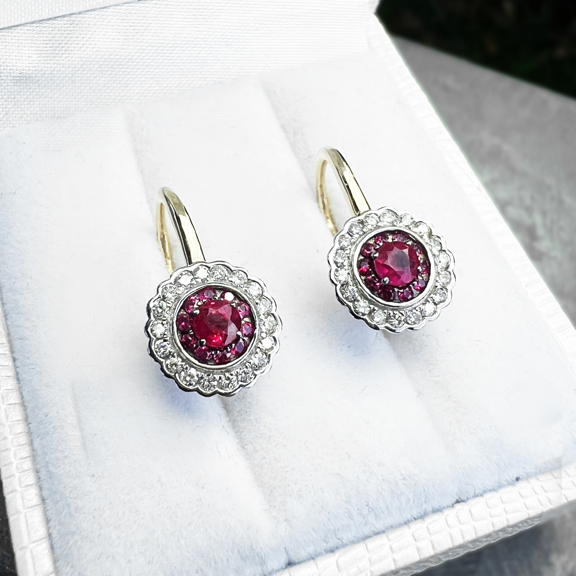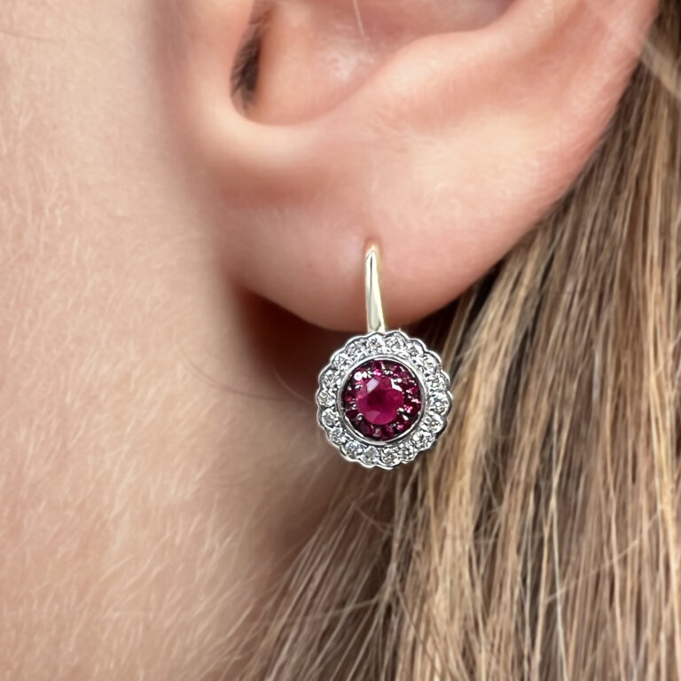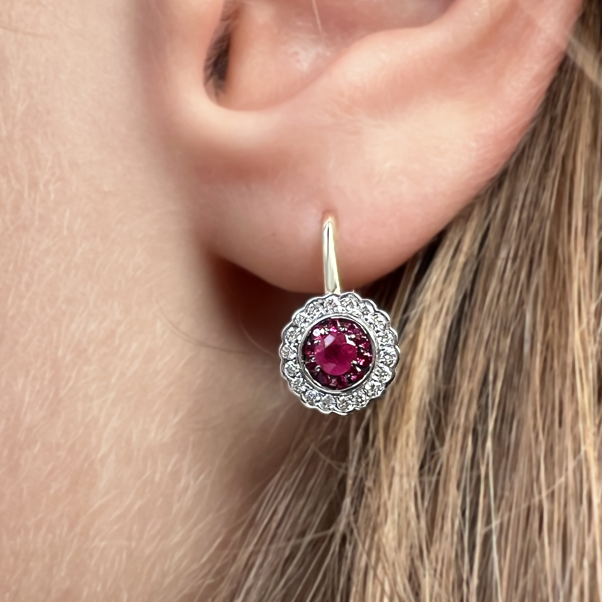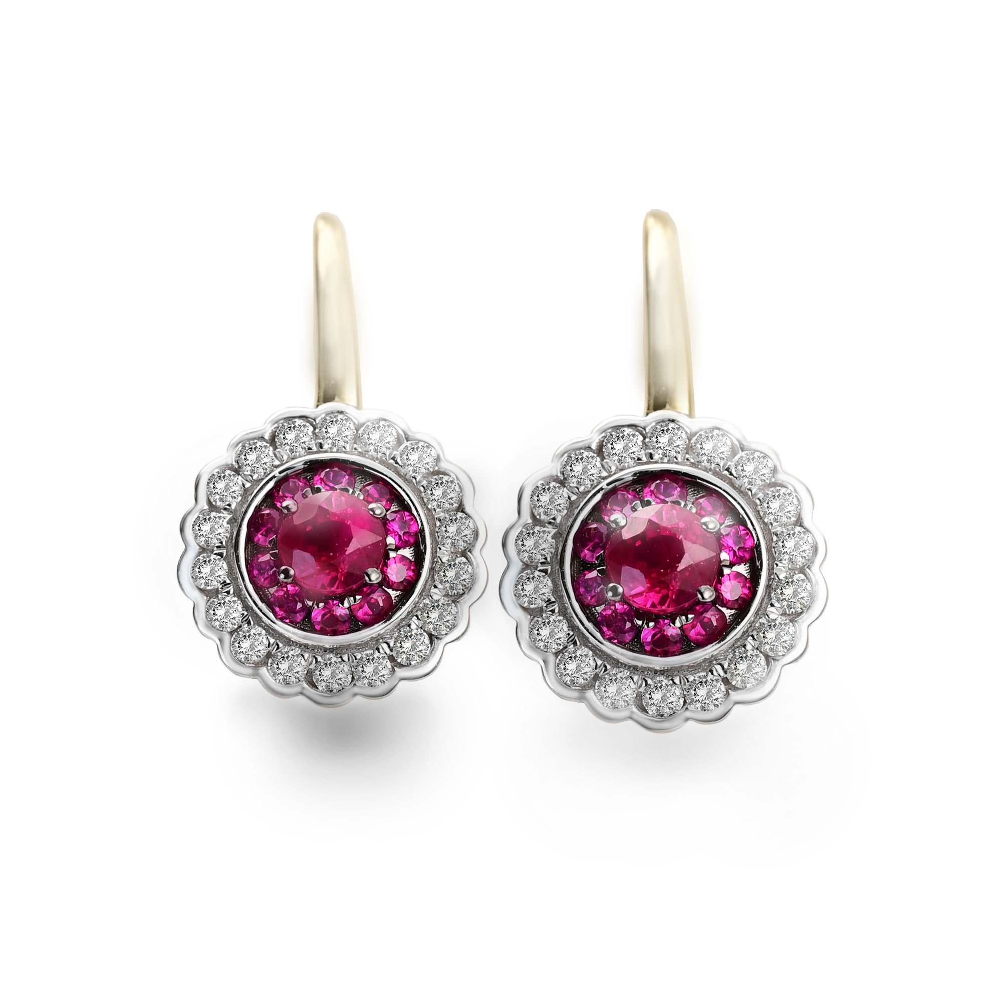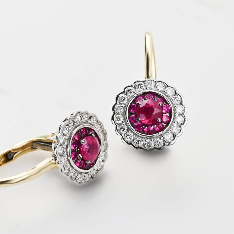 Elegantní zlaté náušnice s rubíny a diamanty.