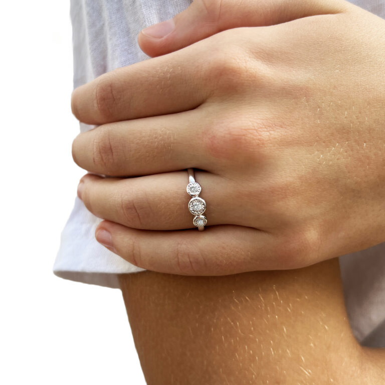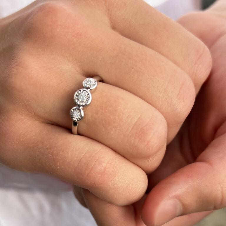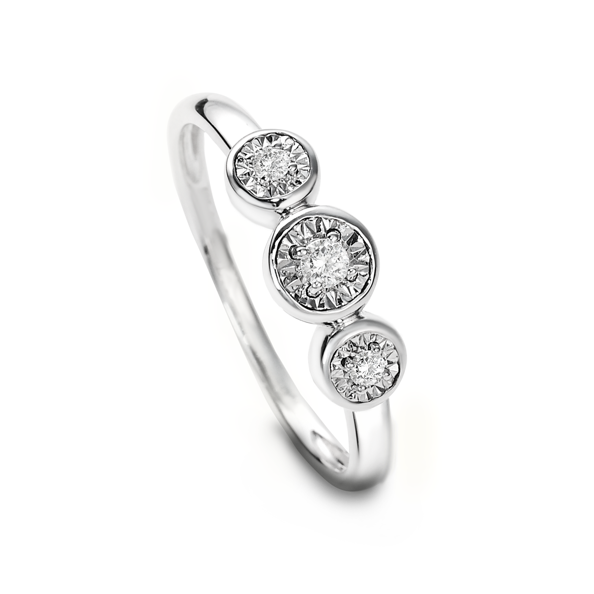 Zlatý prsten se 3 diamanty v bílém zlatě je čistý a nadčasový šperk pro každý den.