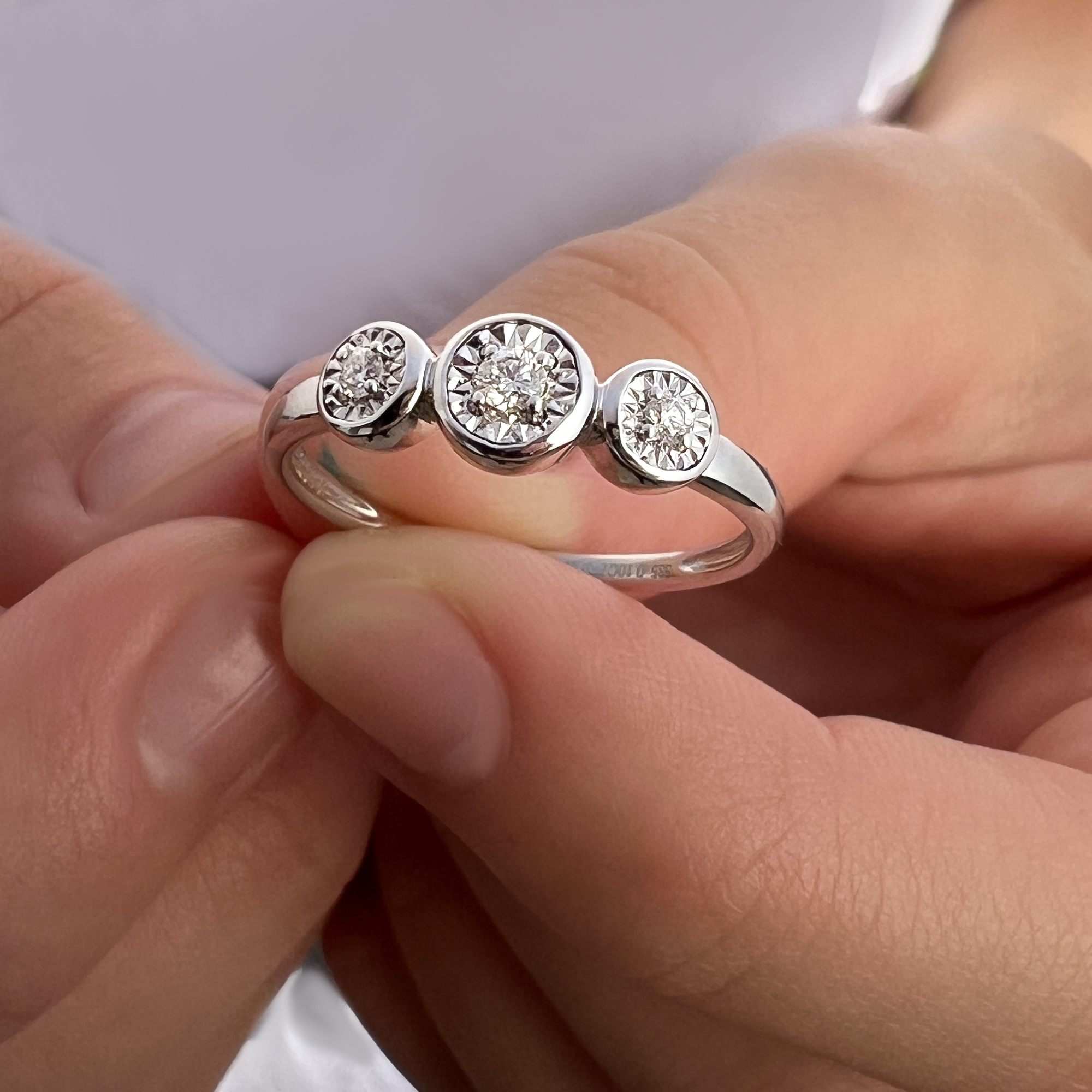 3 přírodní diamanty o celkové váze 0.10 ct kvality Si1 barvy bílé G. Briliantový brus.
